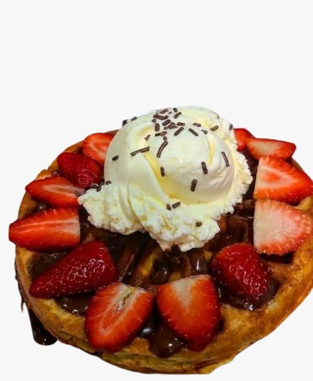 Waffle de pandebono, fresa, banano, dos bolas de helado, crema chantilly y salsa al gusto.
