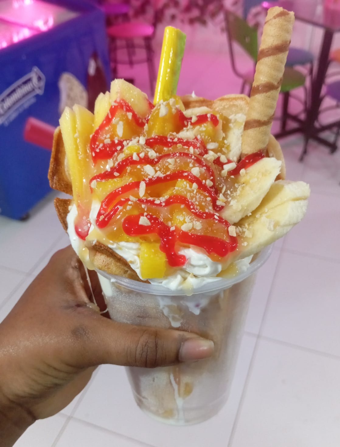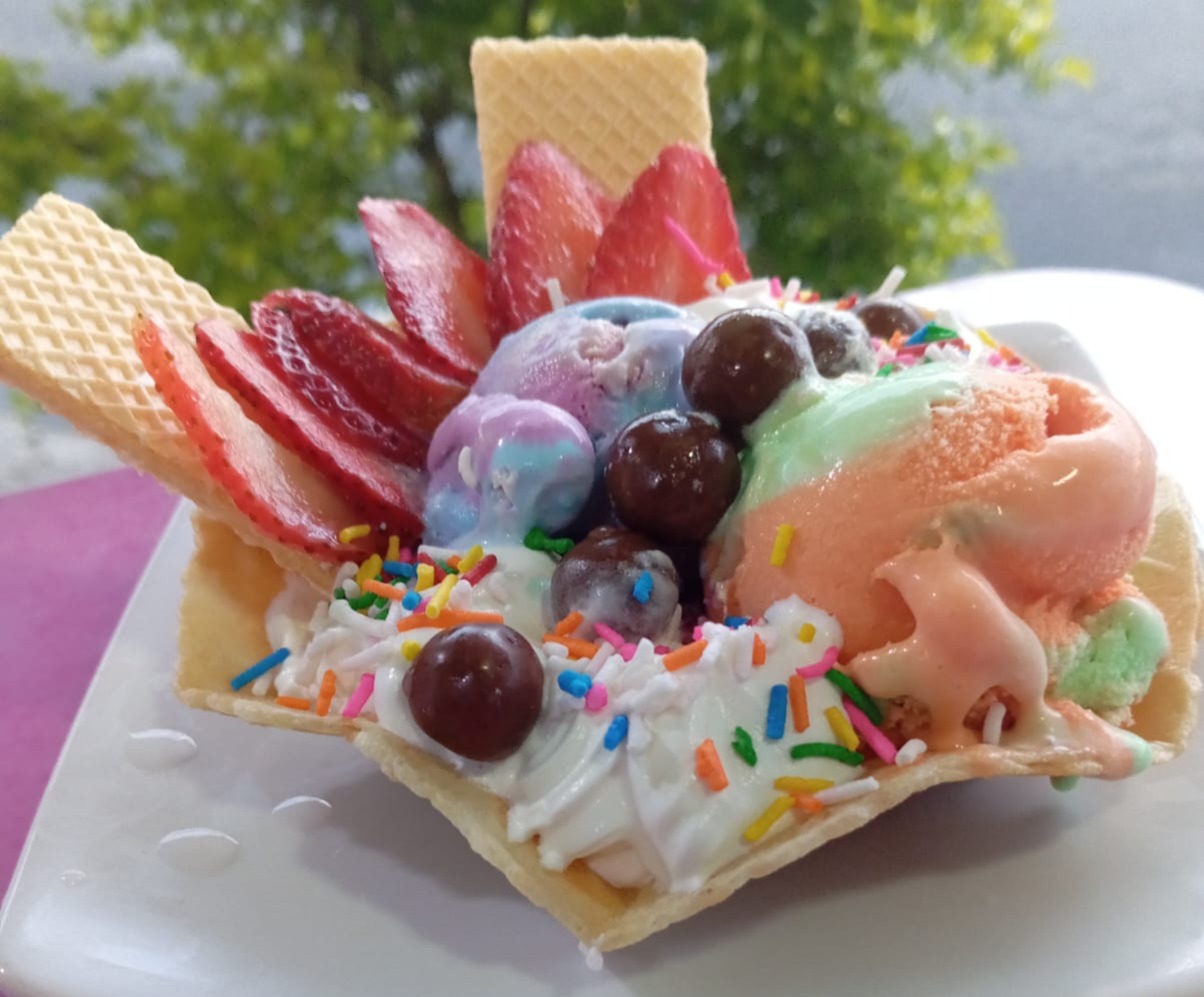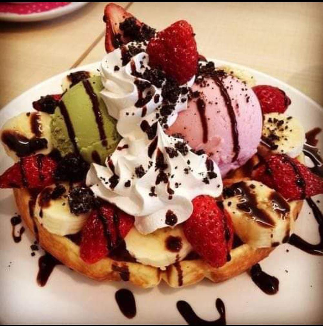 Wafle de pandebono, dos bolas de helado, banano, fresa, mango, piazza, barrilete, crema chantilly, salsa al gusto.