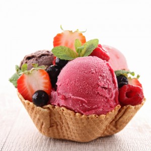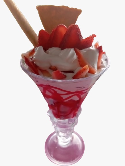 Salsa de frutos rojos, 1 bola de helado, crema chantilly, crema de leche, fresa, 2 topping a elección.
