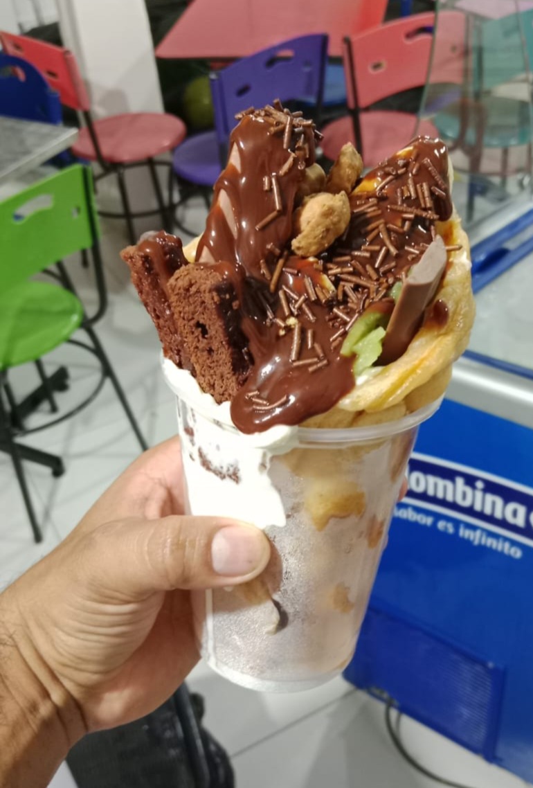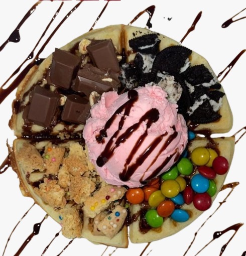 Waffle de pandebono, dos bolas de helado, brownie, crema chantilly, chocolatina jet, mini chips, lluvia de chocolate, salsa de chocolate.