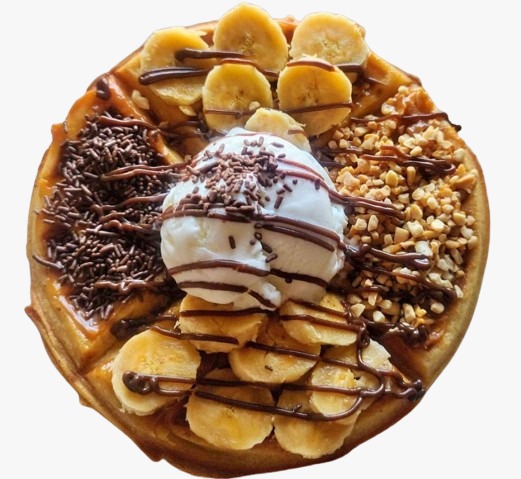 Waffle de pandebono, banano, una bola de helado, maní, lluvia de chocolate, salsa de chocolate.