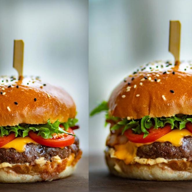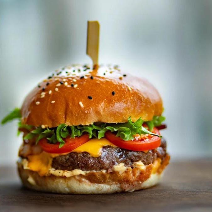 cuatro hamburguesas hechas con carne de verdad como la que comes en casa, jamón, cebolla caramelizada, tomate, queso doble crema, pan