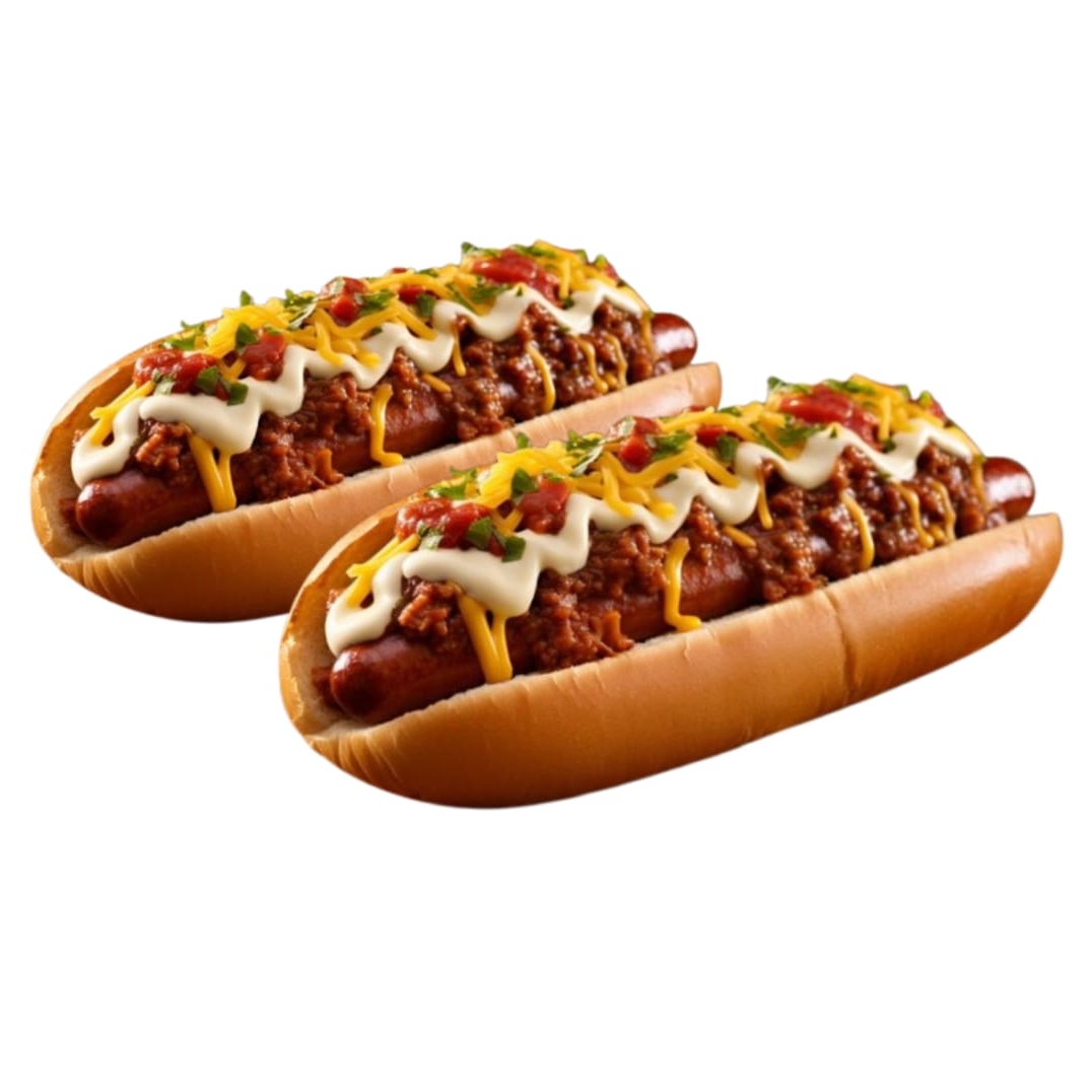 Dos perros, con salchicha. pan, ripio de papa, salsa
