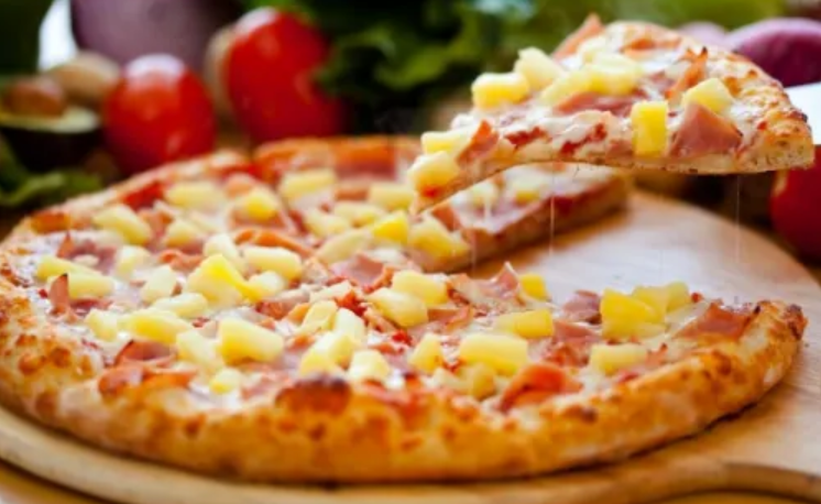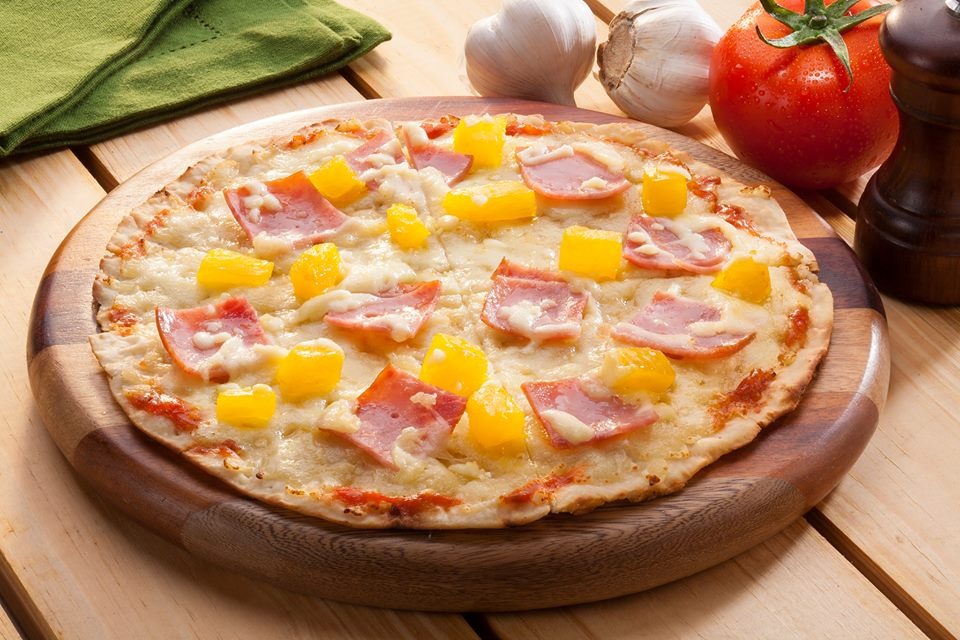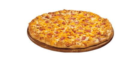 Masa artesanal, salsa napolitana, queso mozzarella, jamon de cerdo y piña.