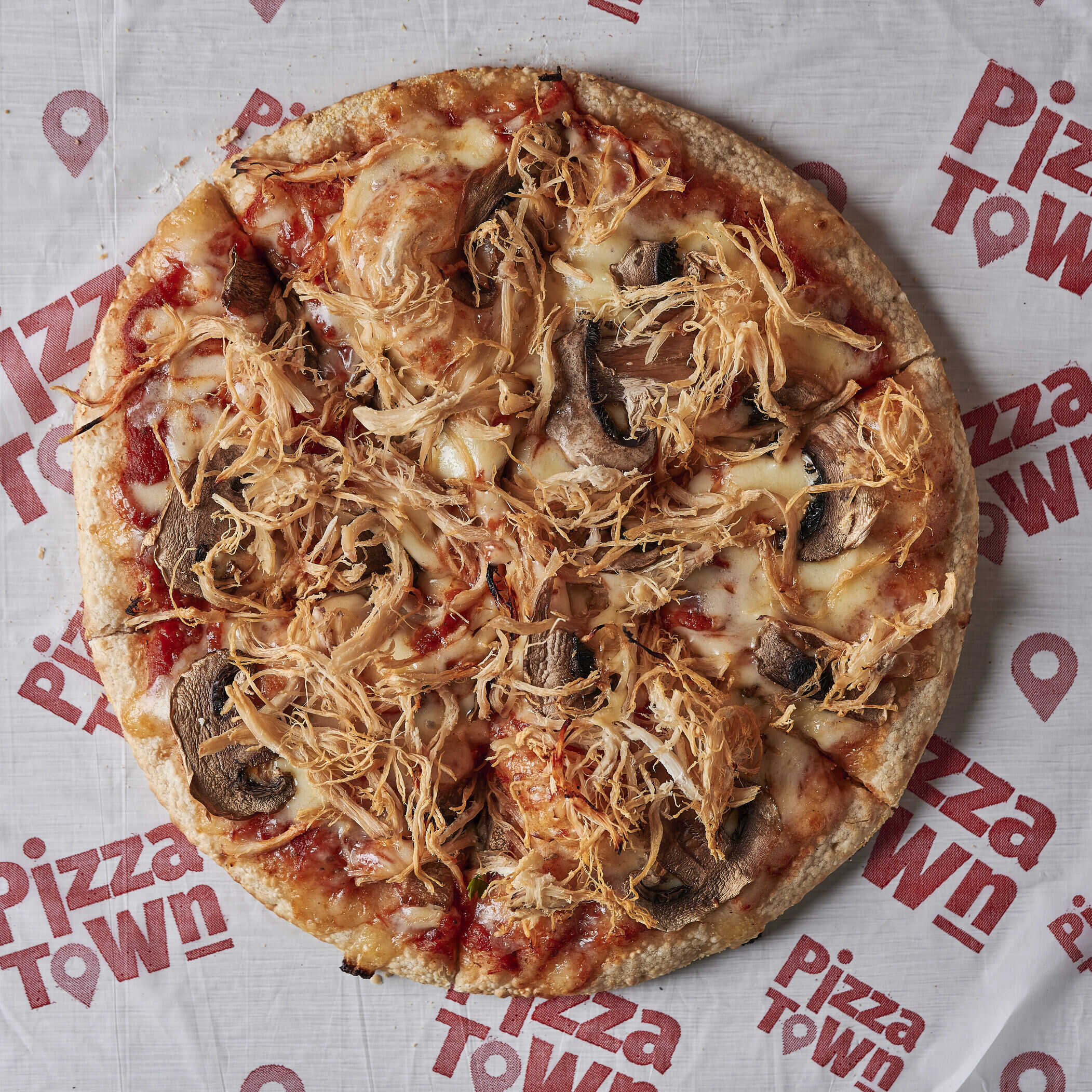 Masa artesanal, salsa napolitana, queso mozzarella, pollo desmechado y champiñones.