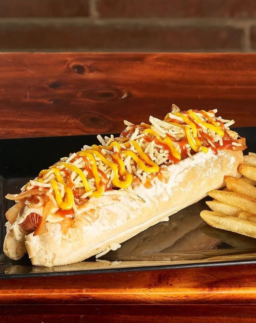 Pan artesanal, salchicha mega vienesa, tocineta ahumada, queso mozzarella, ripio y salsas.