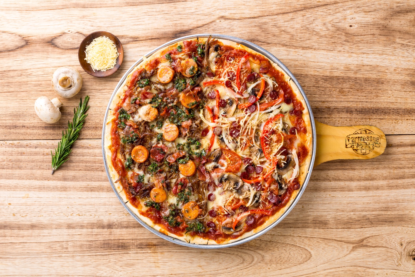 Masa artesanal, salsa napolitana, queso mozzarella, pepperoni, champiñones, cebolla, pimentón y queso parmesano.
