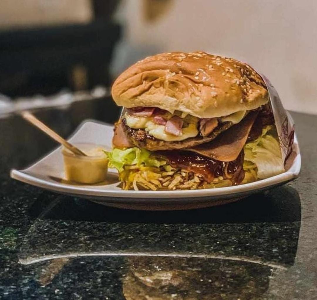 Pan artesanal, carne de hamburguesa, tocineta ahumada, queso mozzarella, cebolla, tomate, lechuga, ripio y salsas.