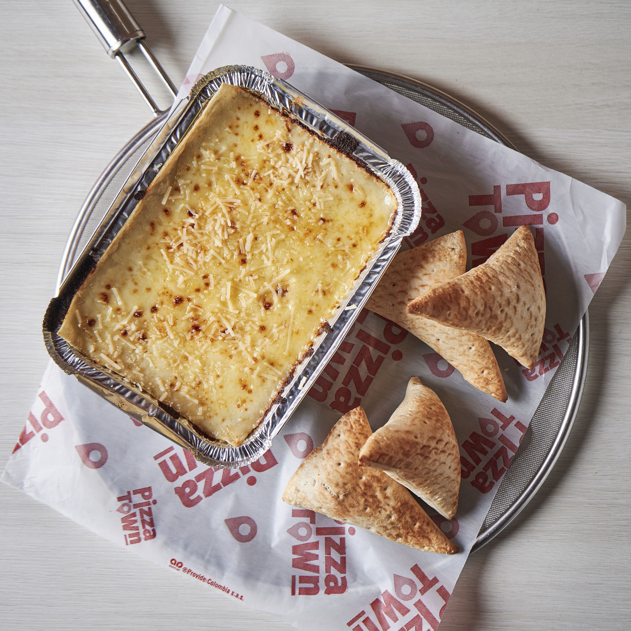 Salsa boloñesa, pasta de lasaña, queso mozzarella, pollo desmechado, salsa bechamel y queso parmesano.