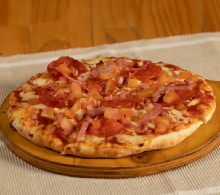 Masa artesanal, salsa napolitana, queso mozzarella, pepperoni, tomate y tocineta ahumada.