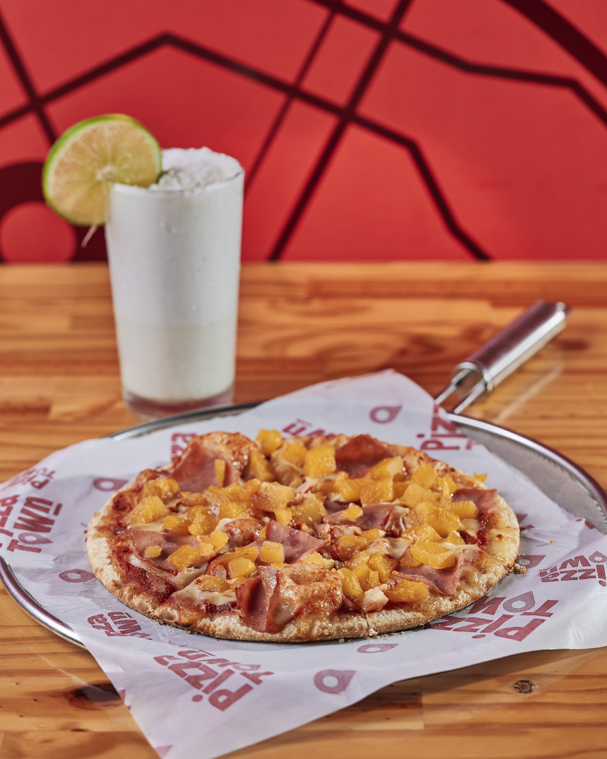 Masa artesanal, salsa napolitana, queso mozzarella, pollo desmechado, piña, tocineta ahumada y salsa BBQ.