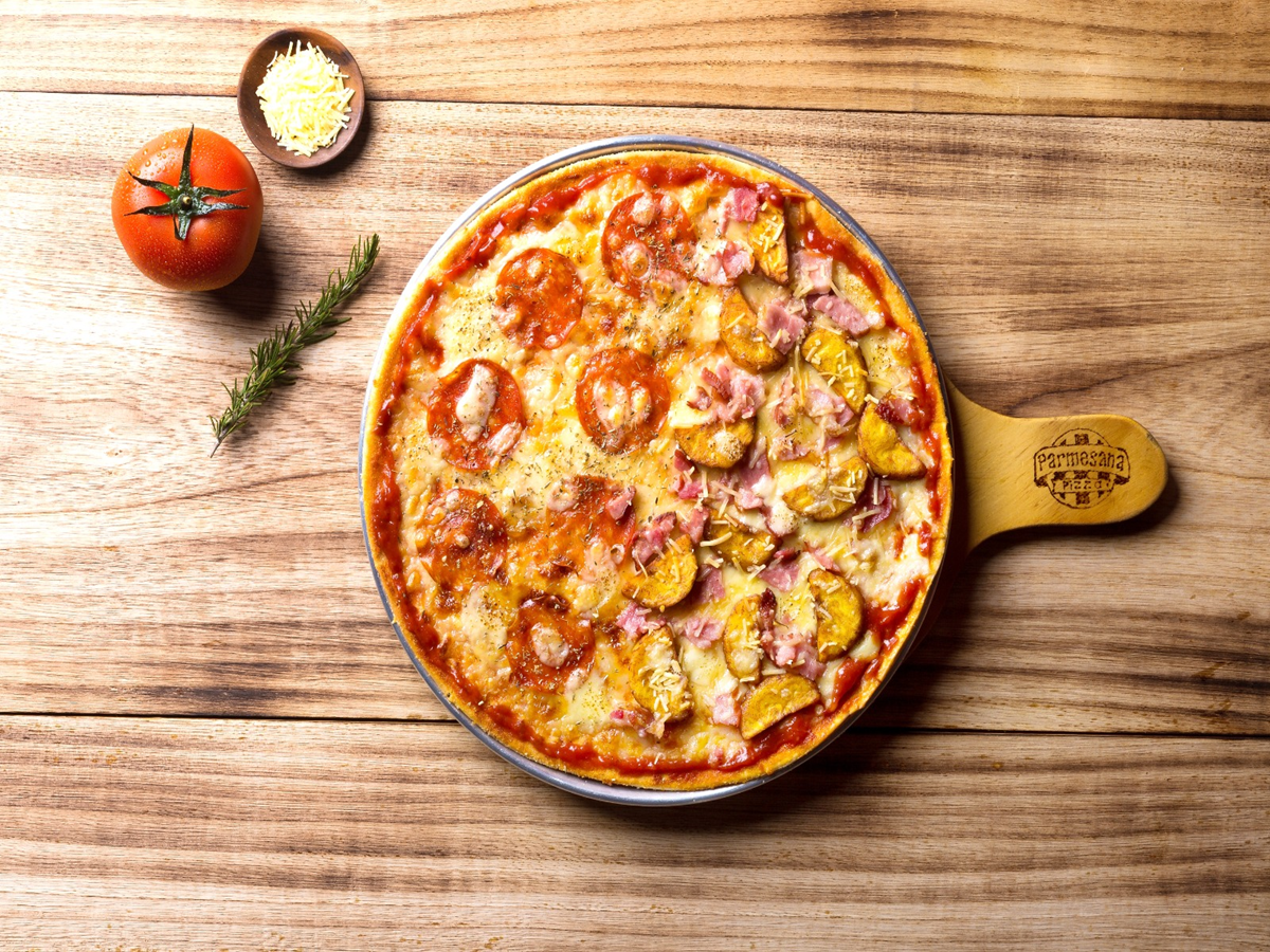Masa artesanal, salsa napolitana, queso mozzarella, maduro, tocineta ahumada.