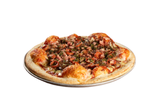 Masa artesanal, salsa napolitana, queso mozzarella, carne desmechada, chorizo, tocineta ahumada y chimichurri.