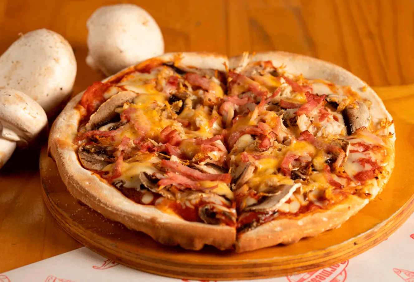Masa artesanal, salsa napolitana, queso mozzarella, pollo desmechado, champiñones, tocineta ahumada.