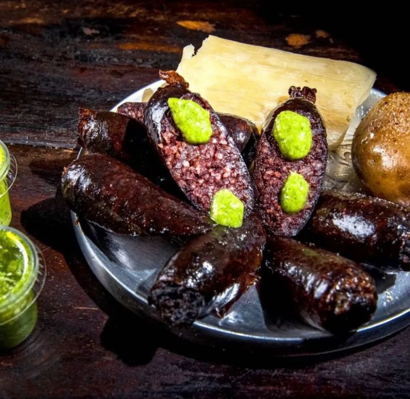 500 gramos de carne, 2 costillas, 1 chorizo y 2 rellenas, acompañada de yuca, papa y moneditas de plátano.