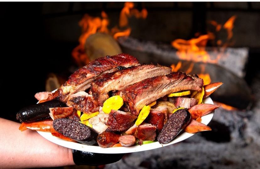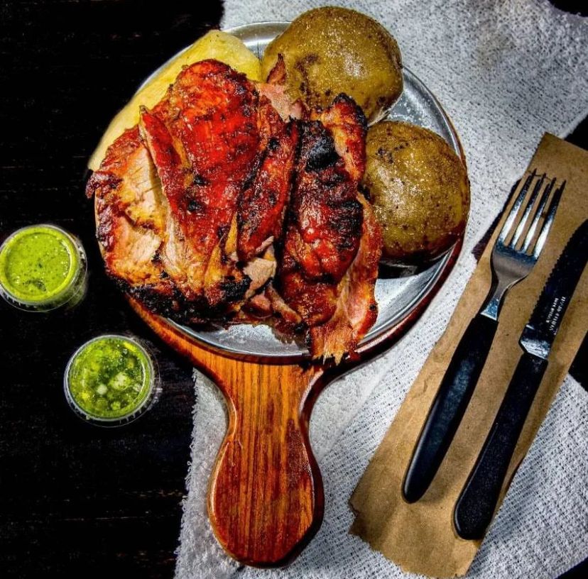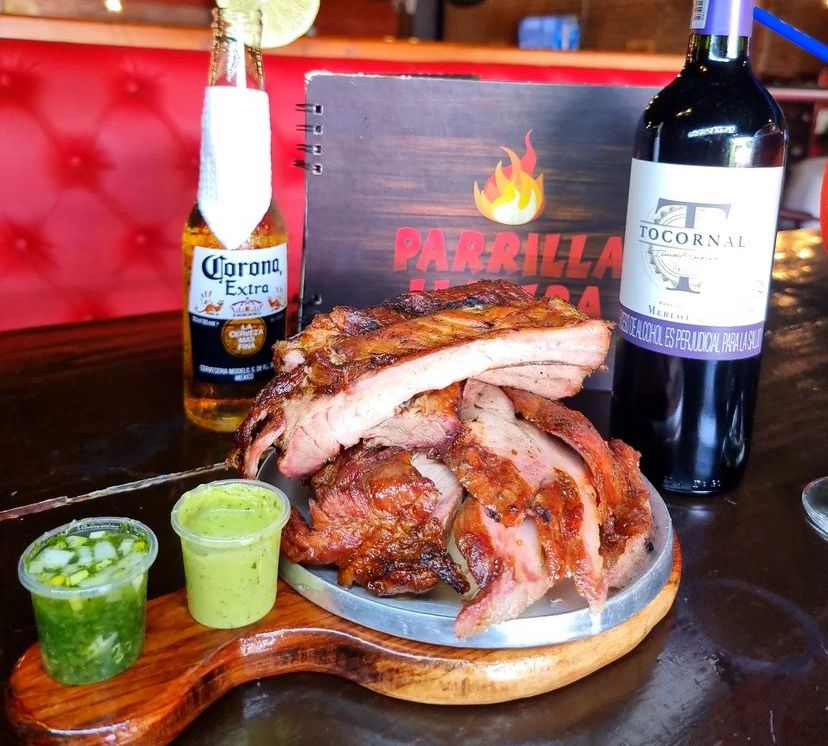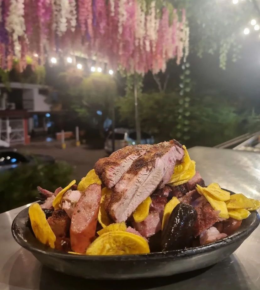 600 gramos de carne, 3 costillas, 2 chorizos y 2 rellenas, acompañada de yuca, papa y moneditas de plátano.