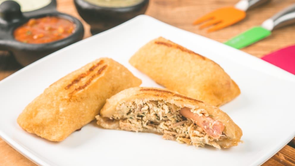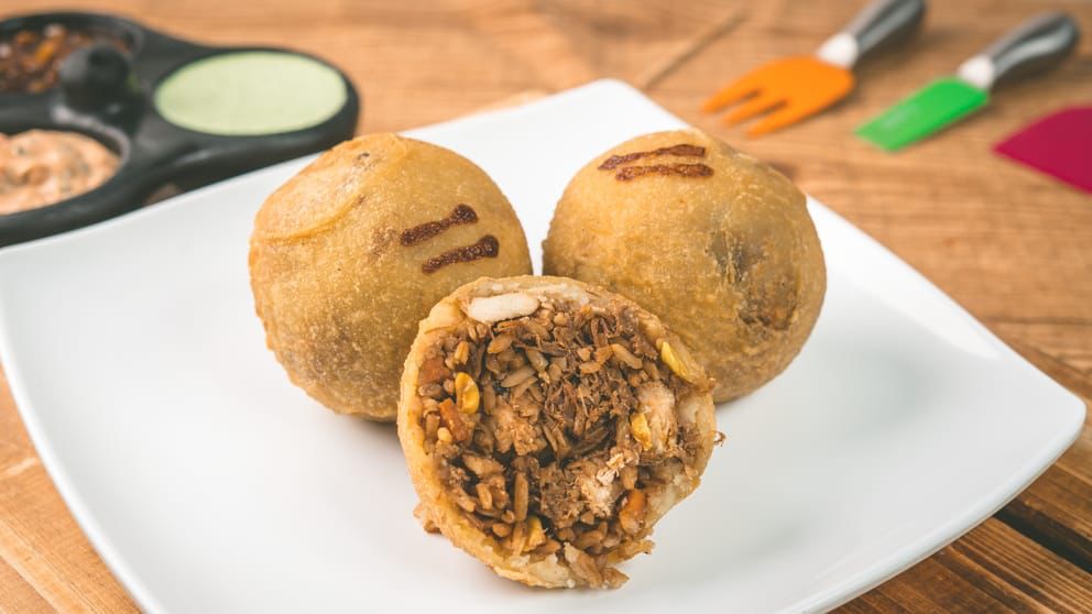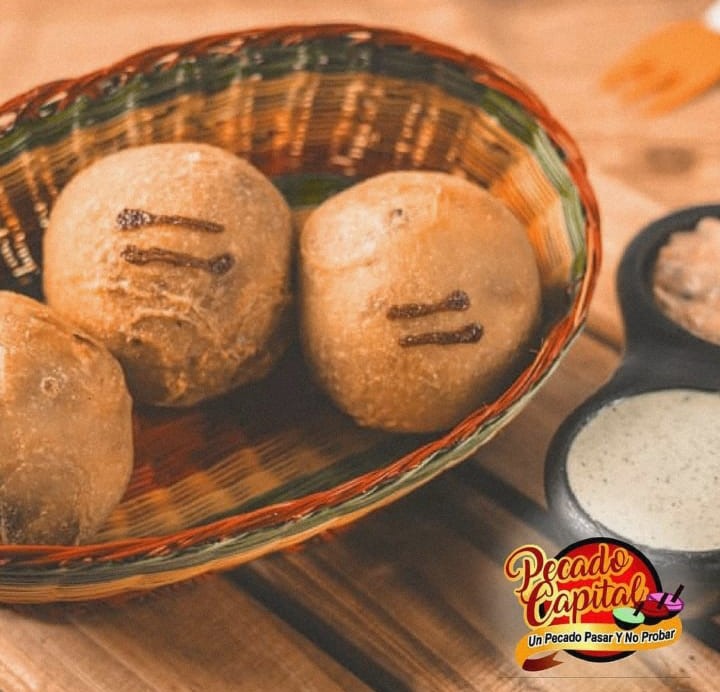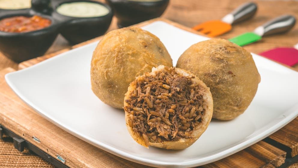 Papa rellena de carne, lomo de cerdo, pollo y maiz tierno.