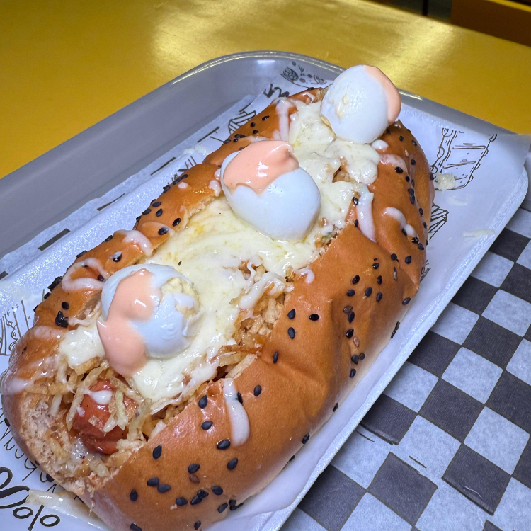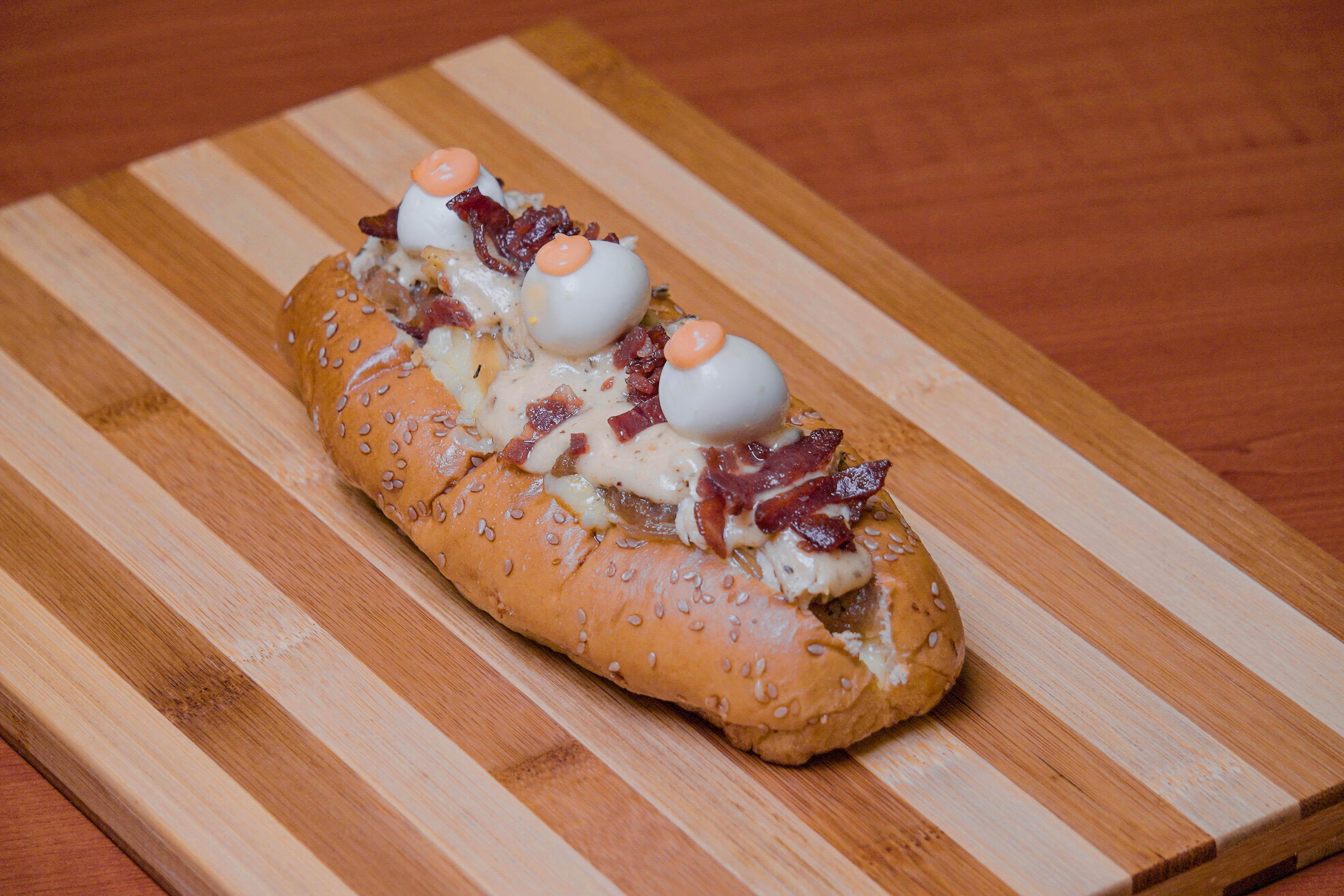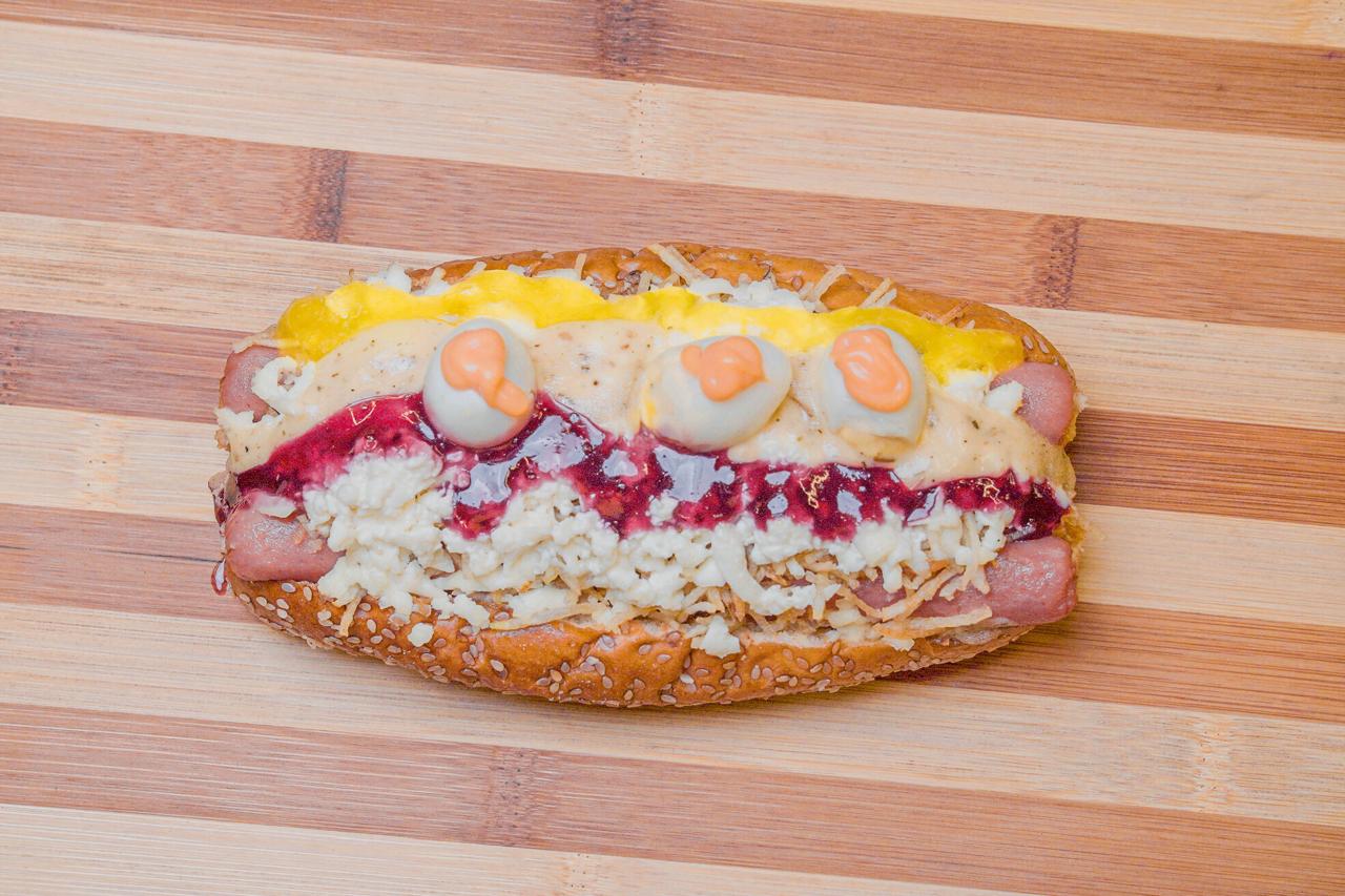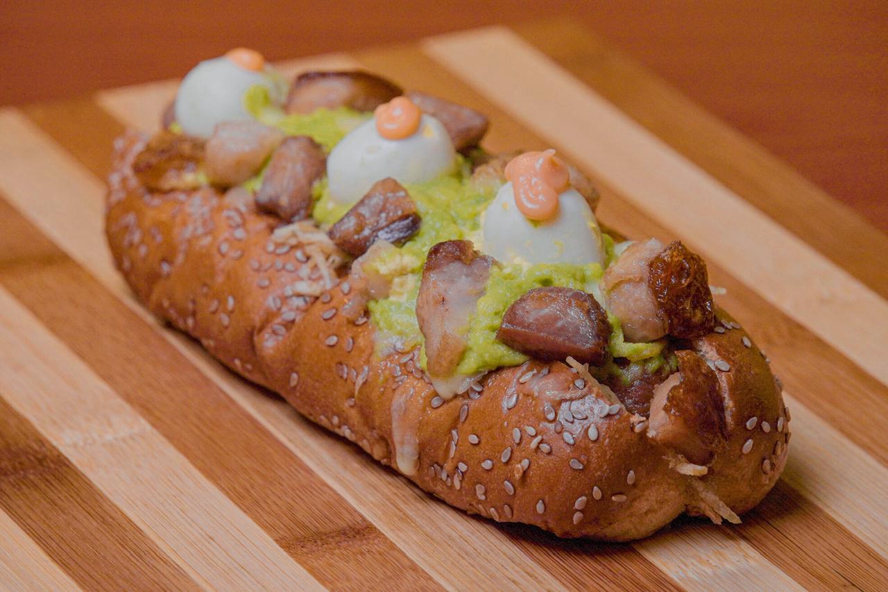 Salchicha americana, ripio de papa, queso mozzarella, huevos de codorniz, salsa tártara y salsa de piña.