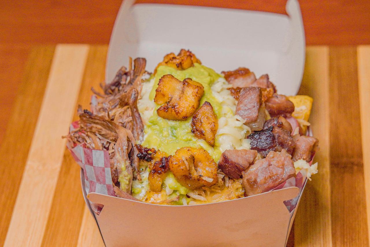 Salchicha americana, ripio de papa, queso mozzarella, huevos de codorniz, salsas, carne de res en salsa criolla y guacamole.