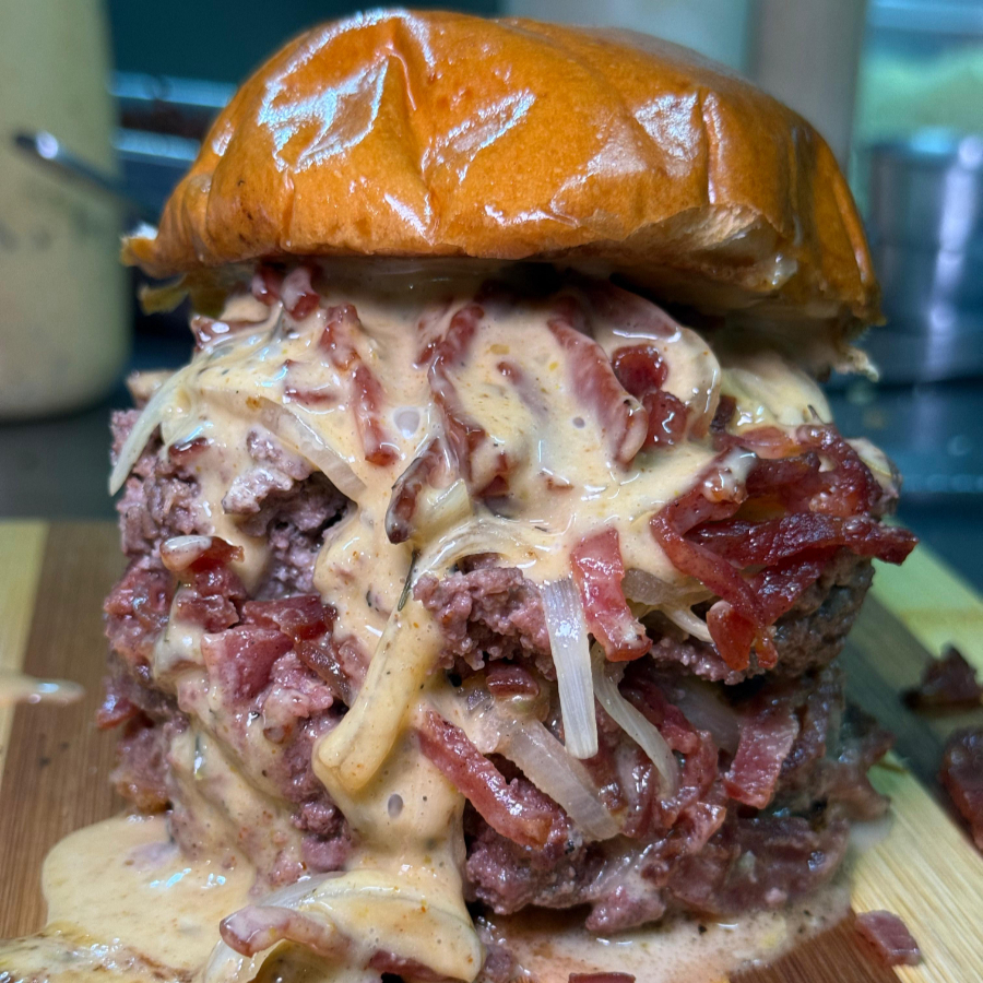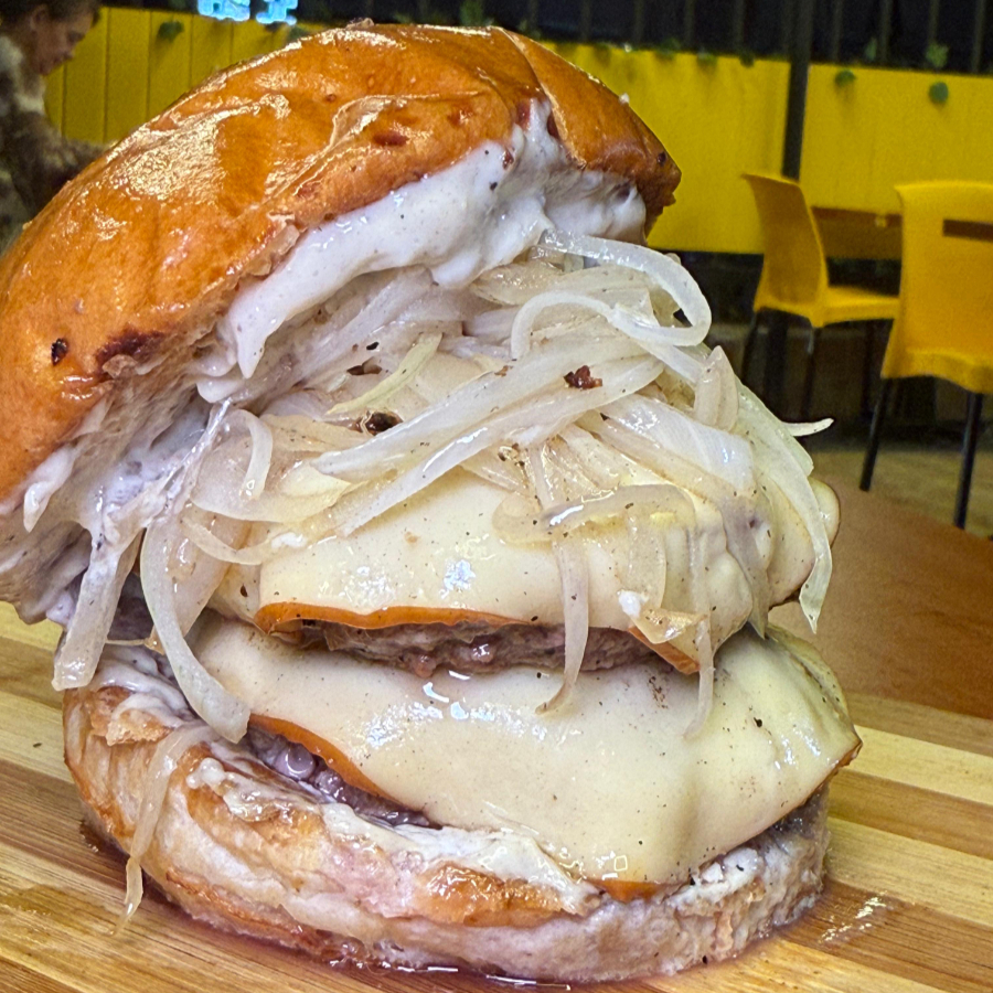 Pan Brioche mantequilloso, doble carne de 150 gr C/U de jugosa mezcla Costilla y Brisket de res, doble queso Gouda Holandés, Cebolla asada en Ajo y mayonesa de champiñones y Pimienta.