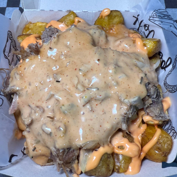 Las famosas papas de IN-N-OUT con sabor caleño: papas criollas bañadas en queso cheddar, carne de res desmechada y su salsa característica.