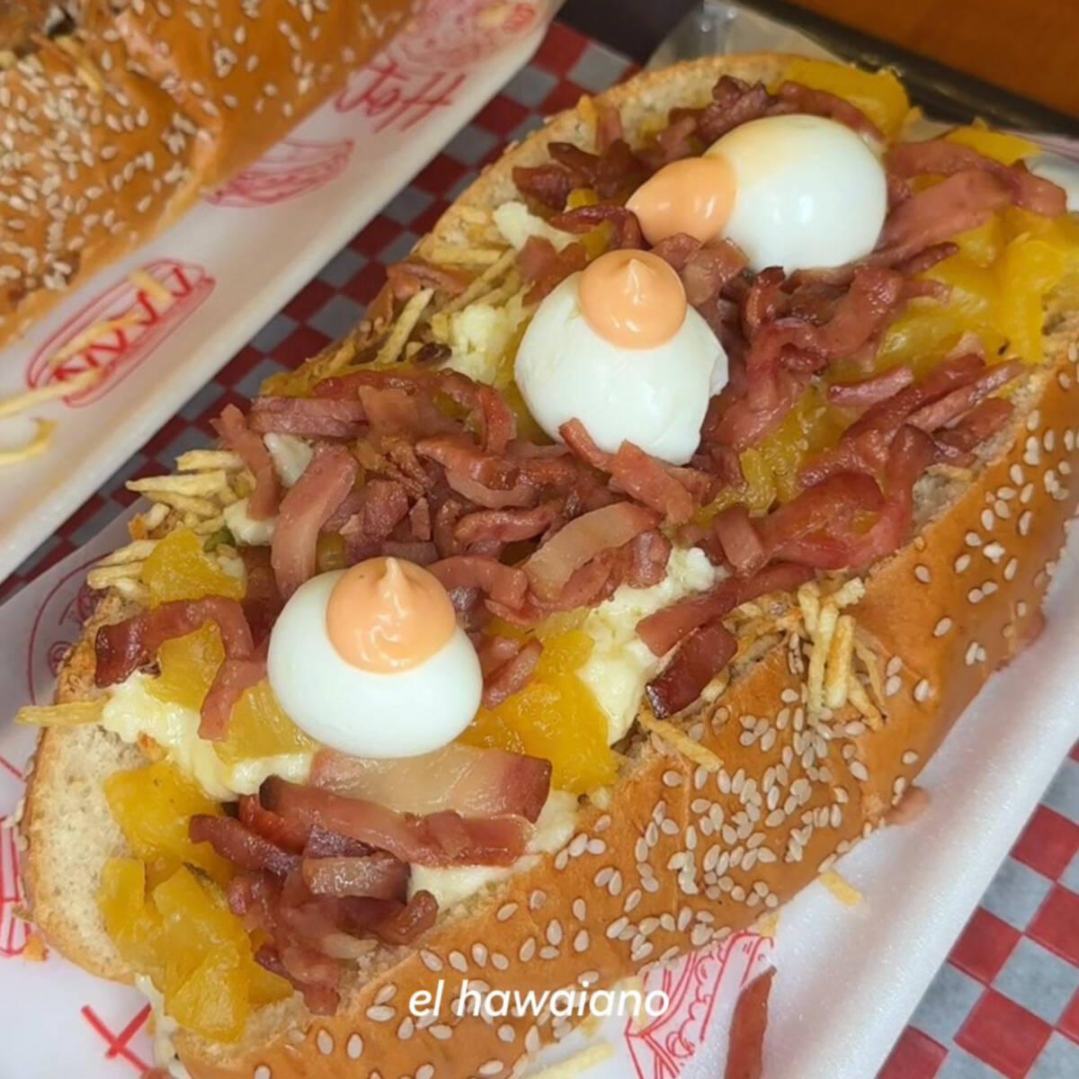 Salchicha americana, ripio de papa, queso mozzarella, huevos de codorniz, salsas, tocineta y piña.