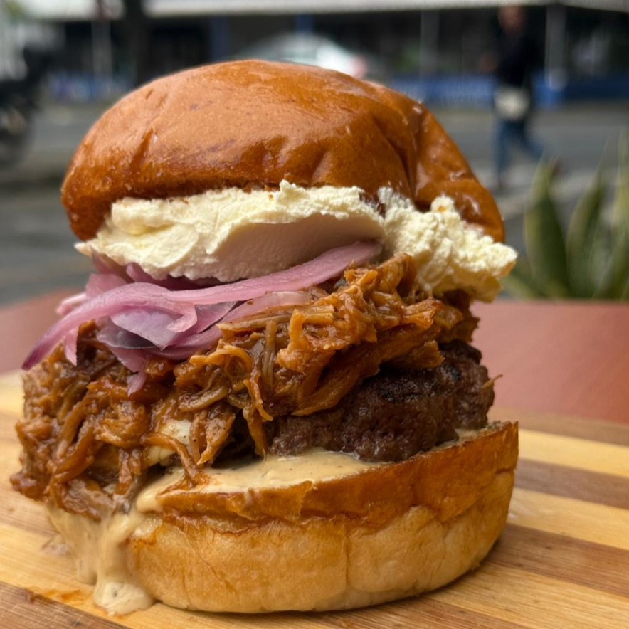 Construida en forma de torre con pan Brioche mantequilloso, 300 gramos de jugosa mezcla Costilla y Brisket de res, queso Cheddar salsa a base de BBQ y miel de abejas peruana, cebolla Caramelizada y tocineta.
