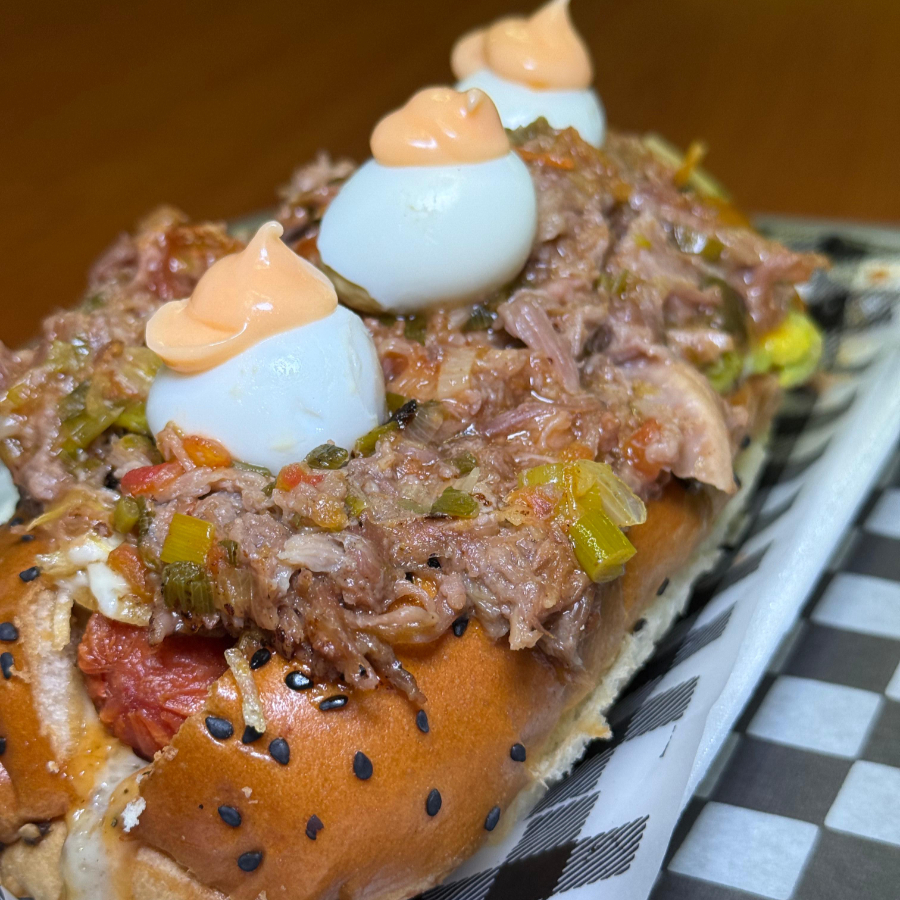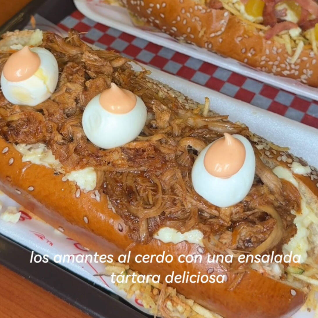 Salchicha americana, ripio de papa, queso mozzarella, huevos de codorniz, salsas, cerdo BBQ y ensalada de repollo y zanahoria.