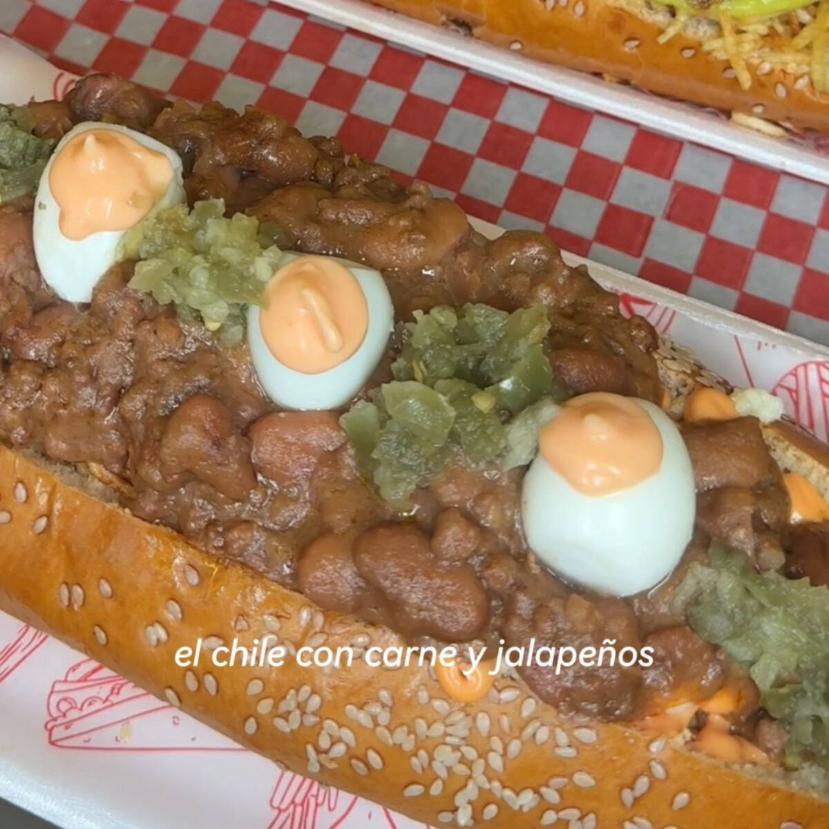 Salchicha americana, ripio de papa, queso mozzarella, huevos de codorniz, salsas, chile con carne y queso cheddar.