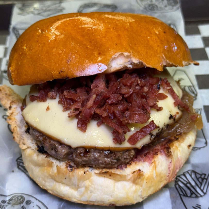 Pan Brioche mantequilloso, 150 gramos de jugosa mezcla de carne de res, salsa a base de BBQ y miel de abejas peruana, cebolla caramelizada y tocineta.