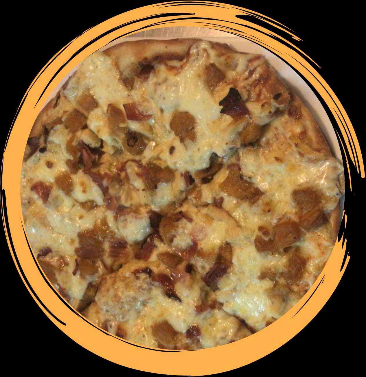 Nuestra exquisita masa tradicional, pasta de tomate natural, queso de la casa, pollo horneado en nuestra exquisita salsa BBQ y chips de cebolla.