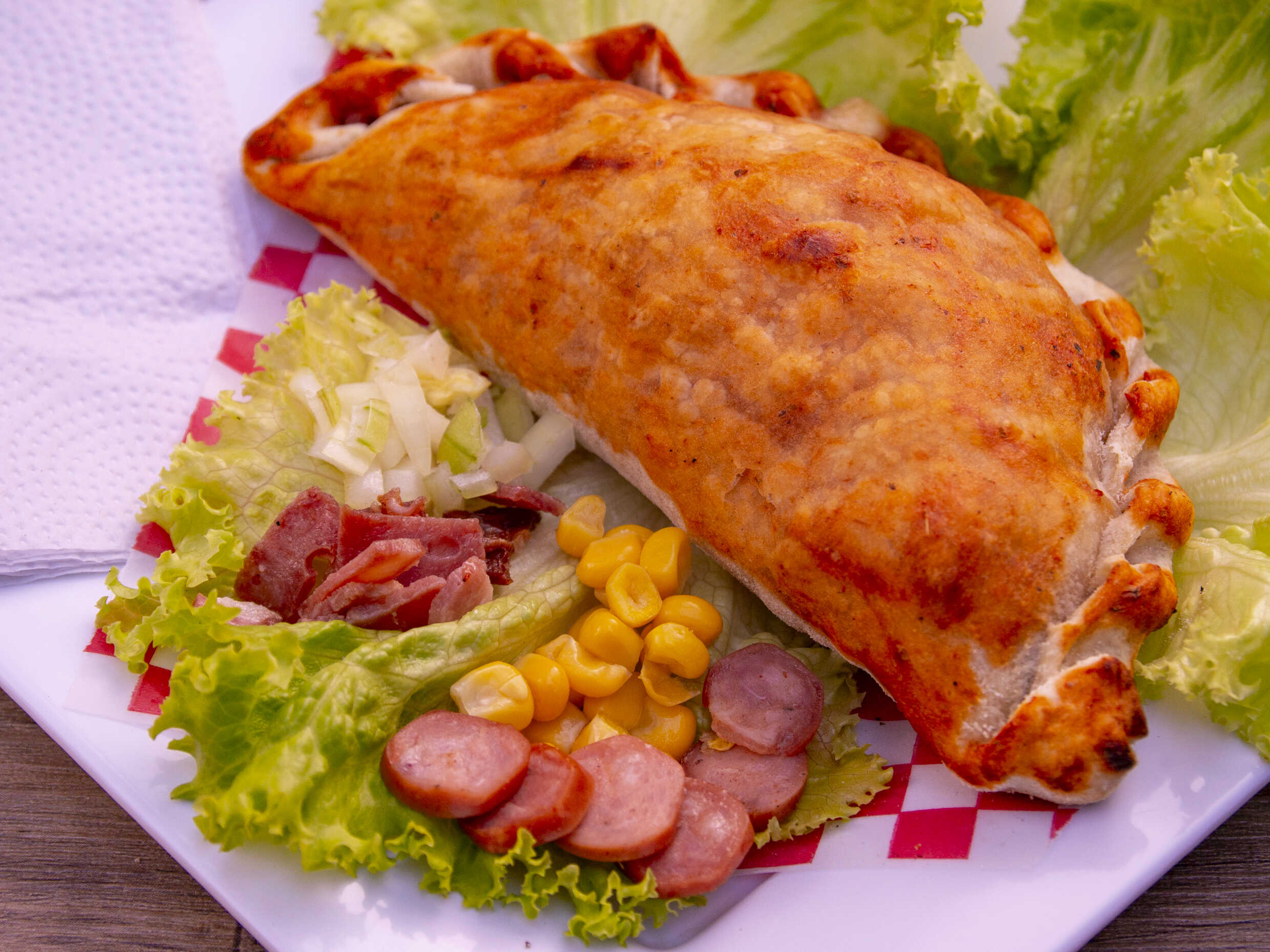 Nuestra exquisita masa tradicional, pasta de tomate natural, queso de la casa, lechuga batavia, salchicha ranchera asada, tocineta asada, maicitos y cebolla.