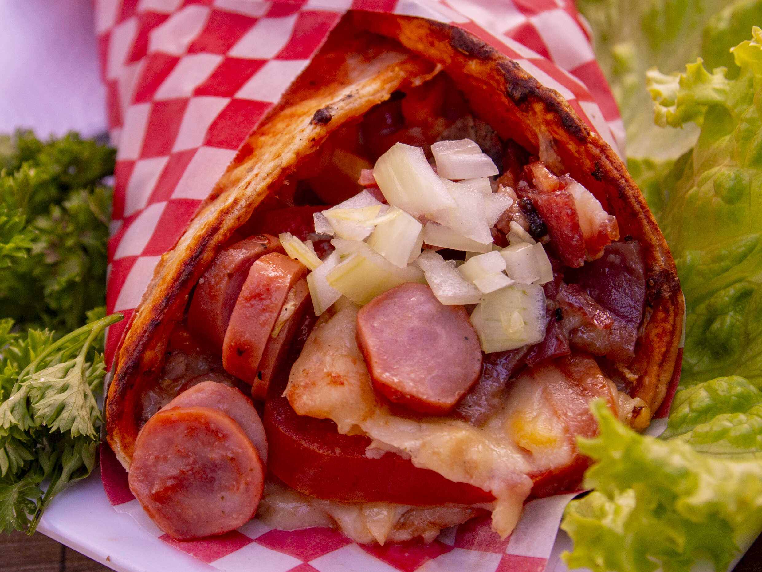 Nuestra exquisita masa tradicional, pasta de tomate natural, queso de la casa, lechuga batavia, salchicha ranchera asada, tocineta asada y cebolla.