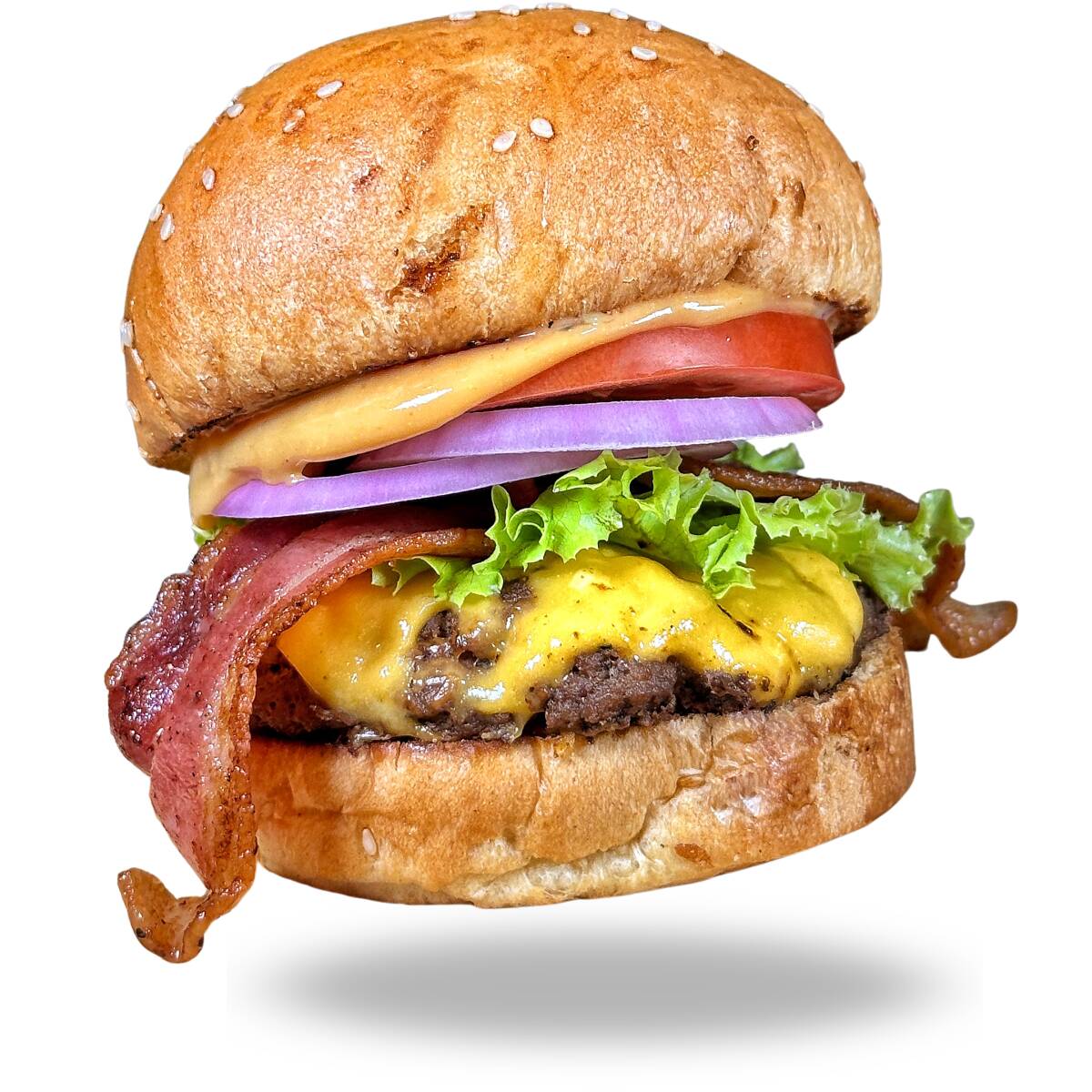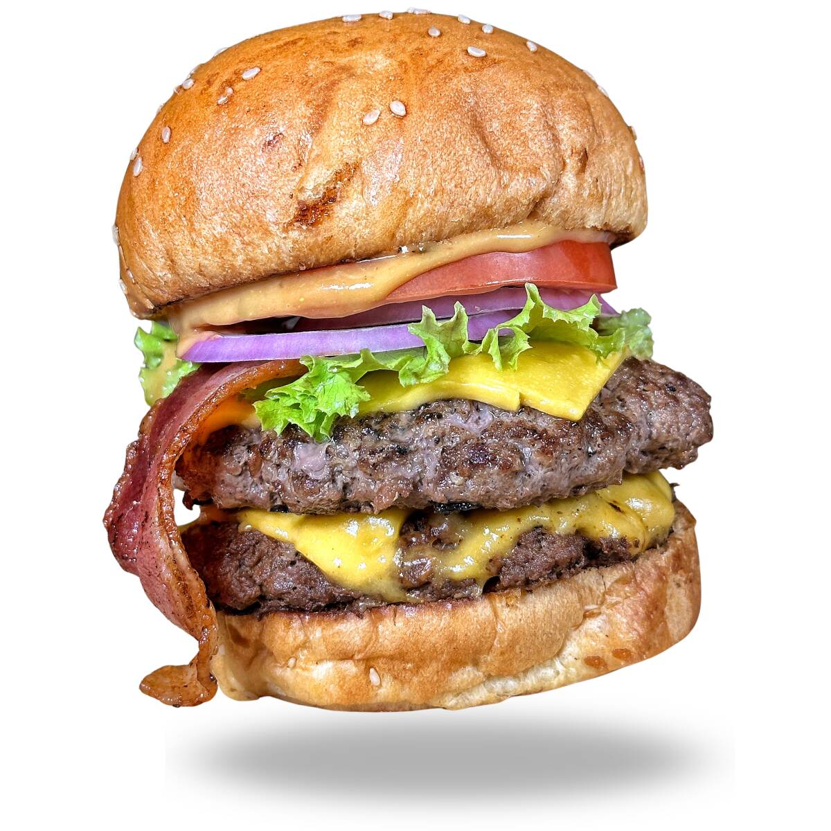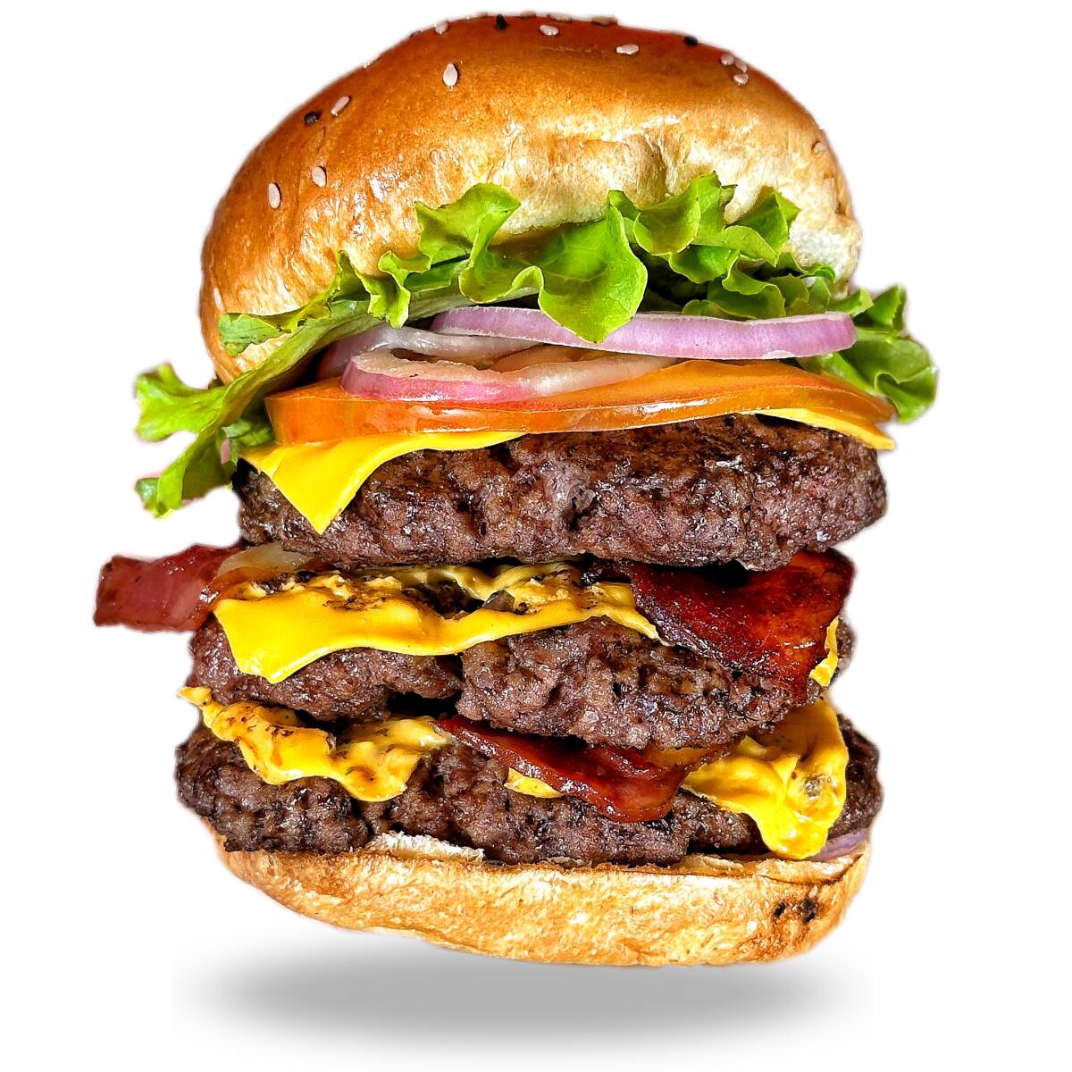 Pan brioche, 450 gr angus, triple queso americano, doble tocineta, lechuga, tomate, cebolla y salsa de la casa.
