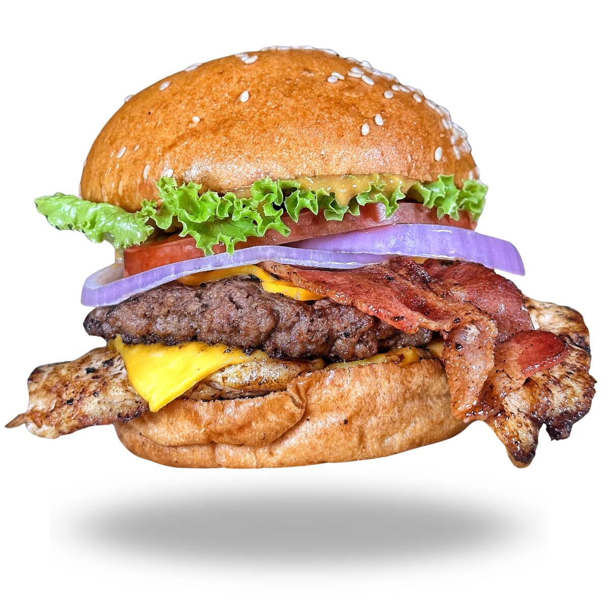 Pan brioche, 140gr pechuga de pollo, 150gr angus, doble queso americano, tocineta, cebolla, tomate, lechuga, salsa pipps, salsa verde.