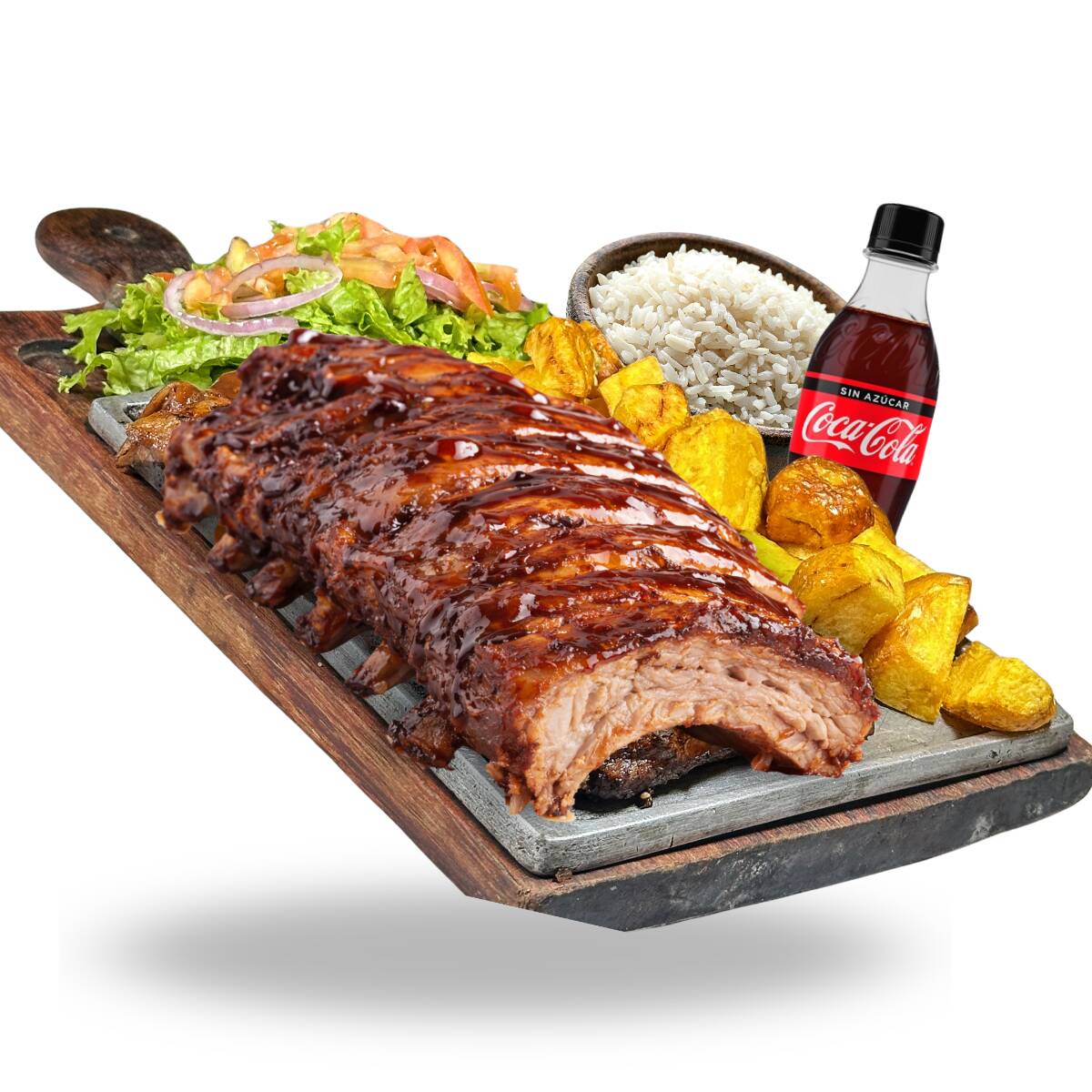 COSTILLA SAN LUIS 450-500GR APROX, PAPA AMARILLA, ENSALADA, ARROZ, COCA COLA CERO 250ML