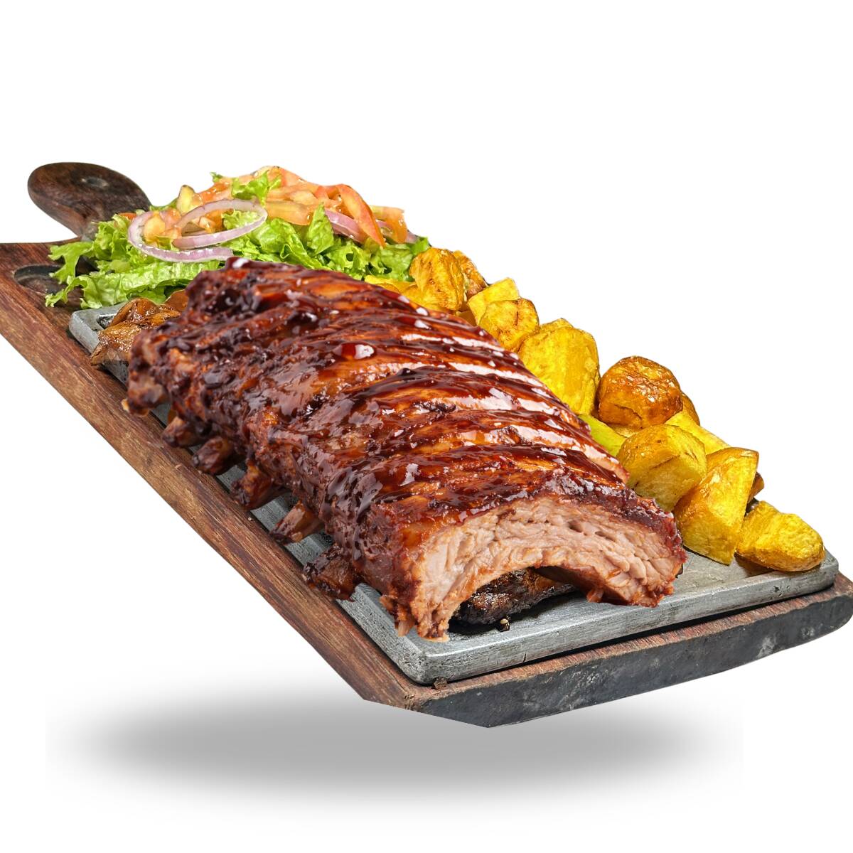 Costilla san luis (500gr aprox) acompañada con papa amarilla y ensalada
