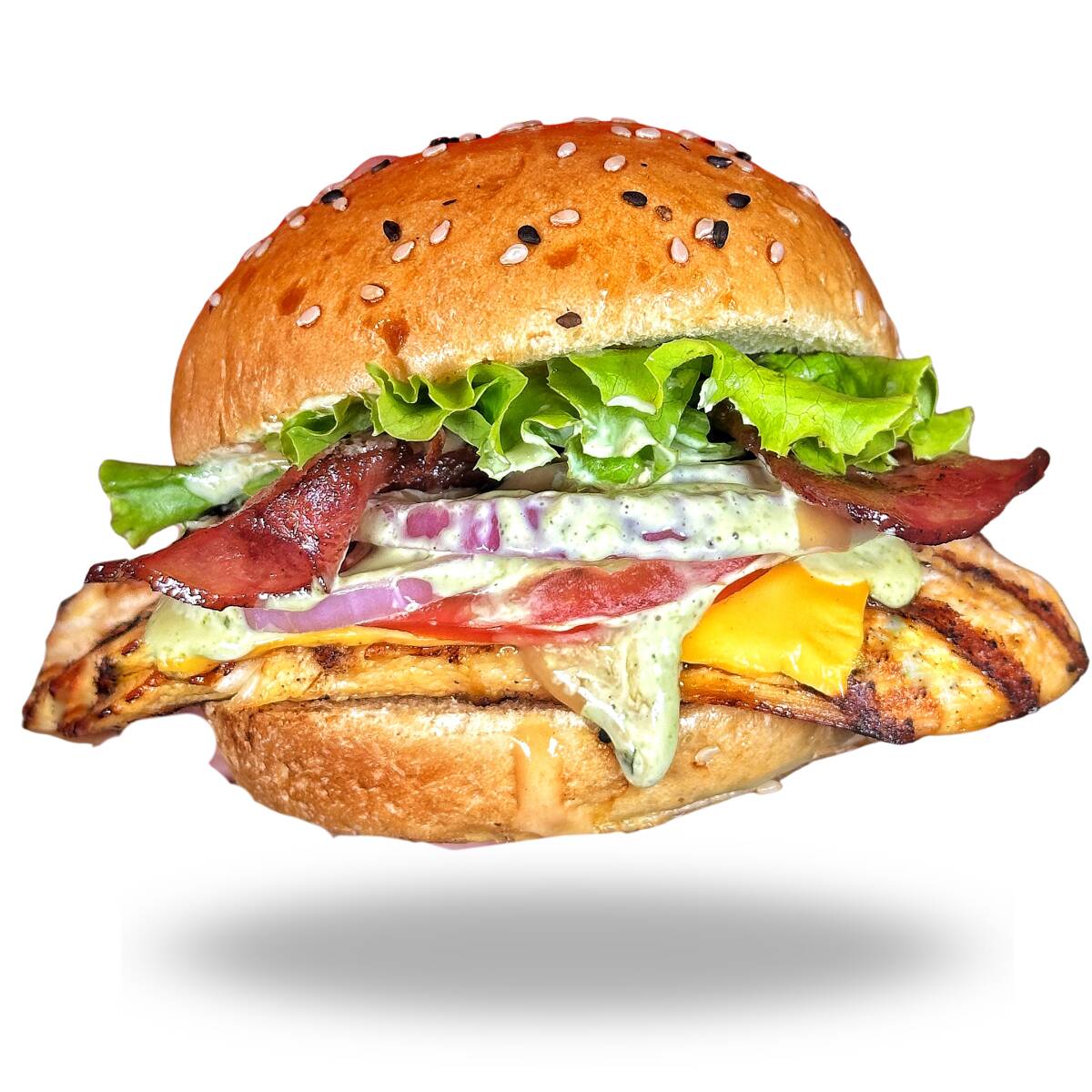 Pan brioche, 140gr pechuga de pollo, tocineta, queso americano, lechuga, cebolla, tomate, salsa pipps, salsa verde.
