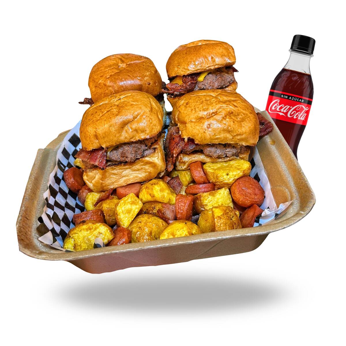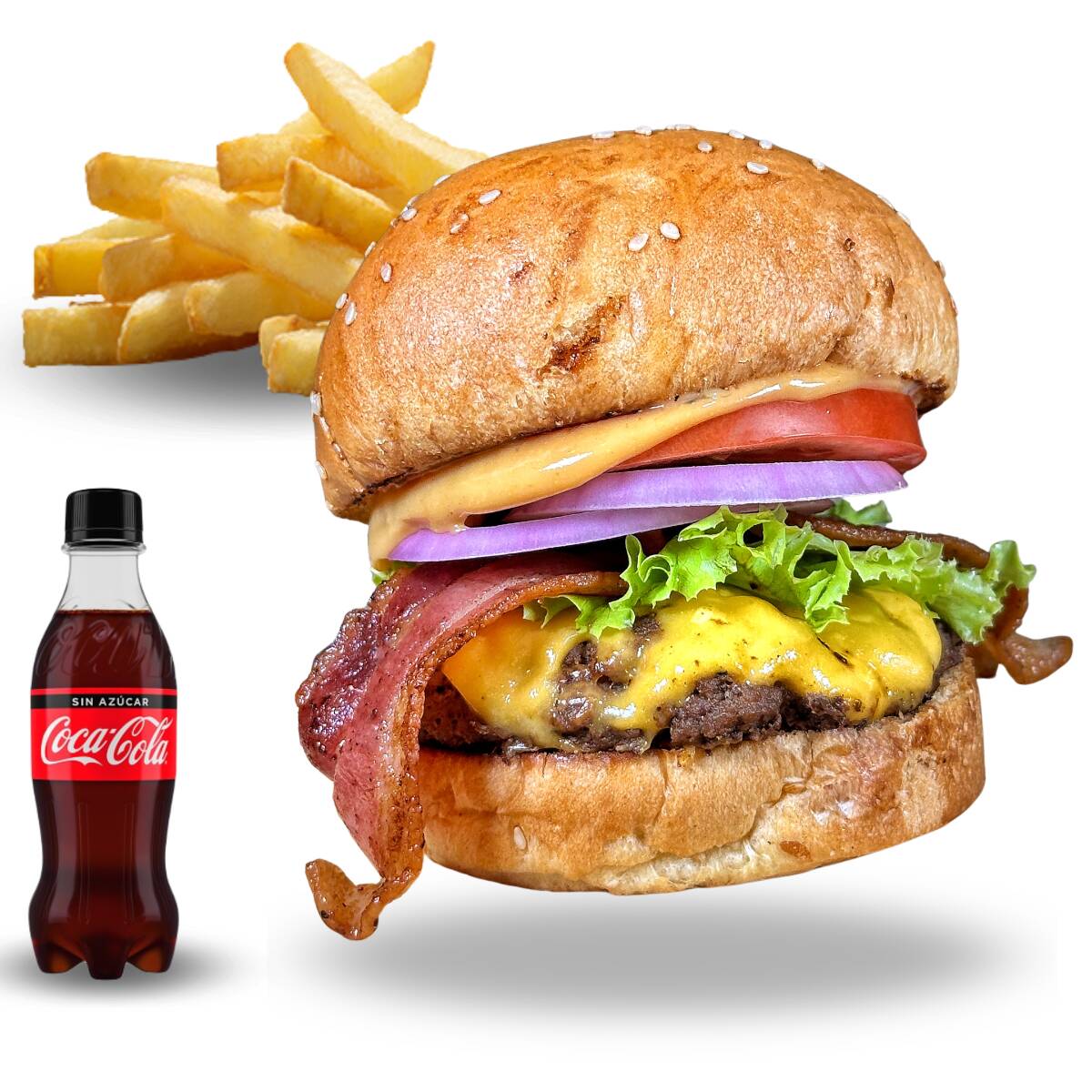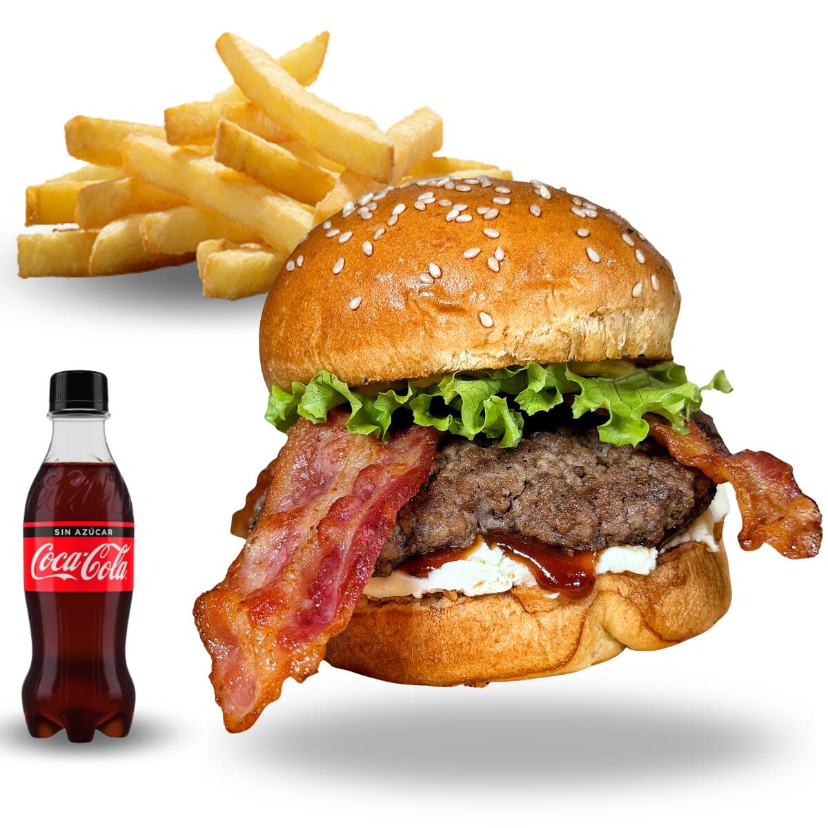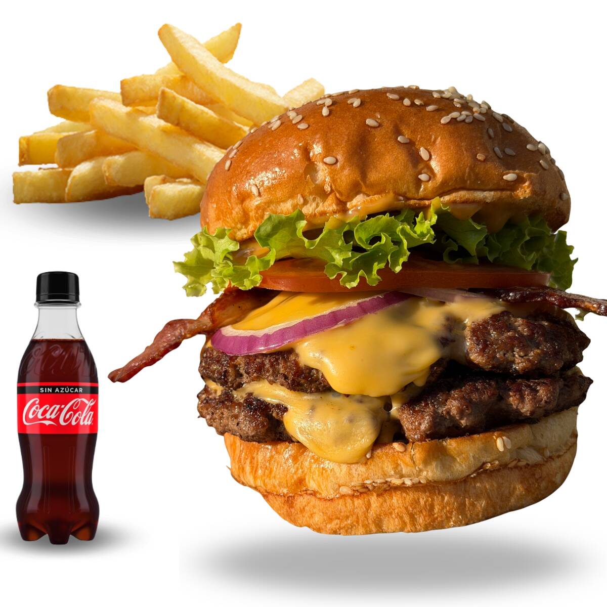 Hamburguesa la doble 300gr angus, papas a la francesa, coca cola cero 250ml.