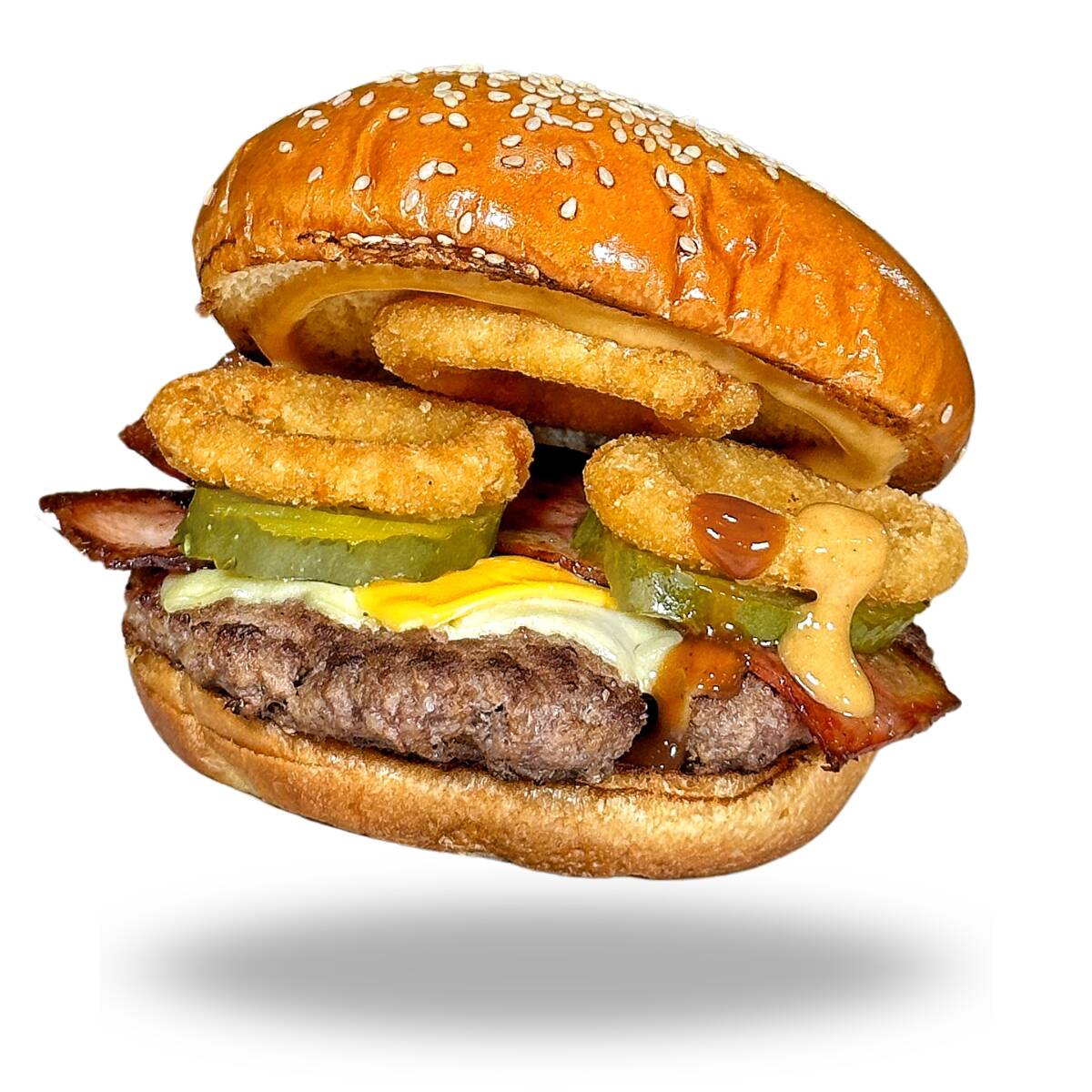 Pan brioche, 150gr angus, aros de cebolla, pepinillos, tocineta, queso americano, queso mozzarella, salsa pipps, bbq.