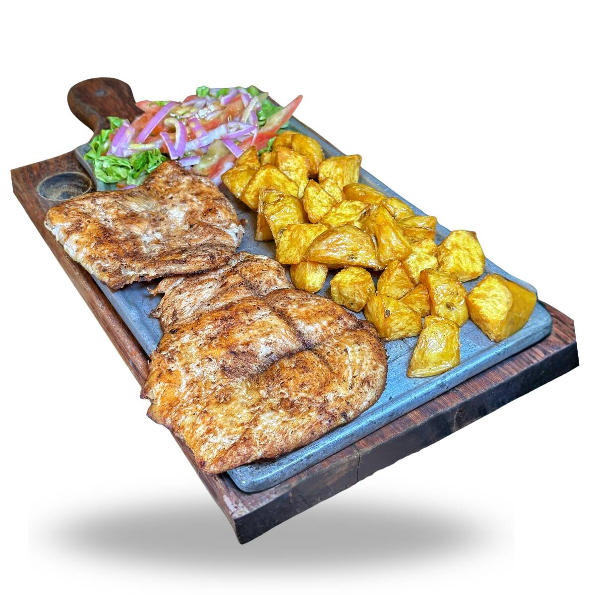250Gr aprox de pechuga de pollo a la parrilla, acompañado con papa amarilla y ensalada.