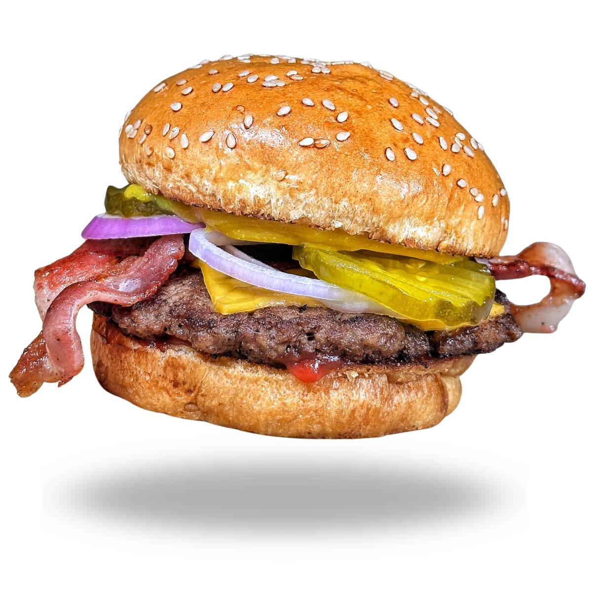 Pan brioche, 150 gr angus, queso americano, tocineta, pepinillos, cebolla, salsa de tomate y mostaza