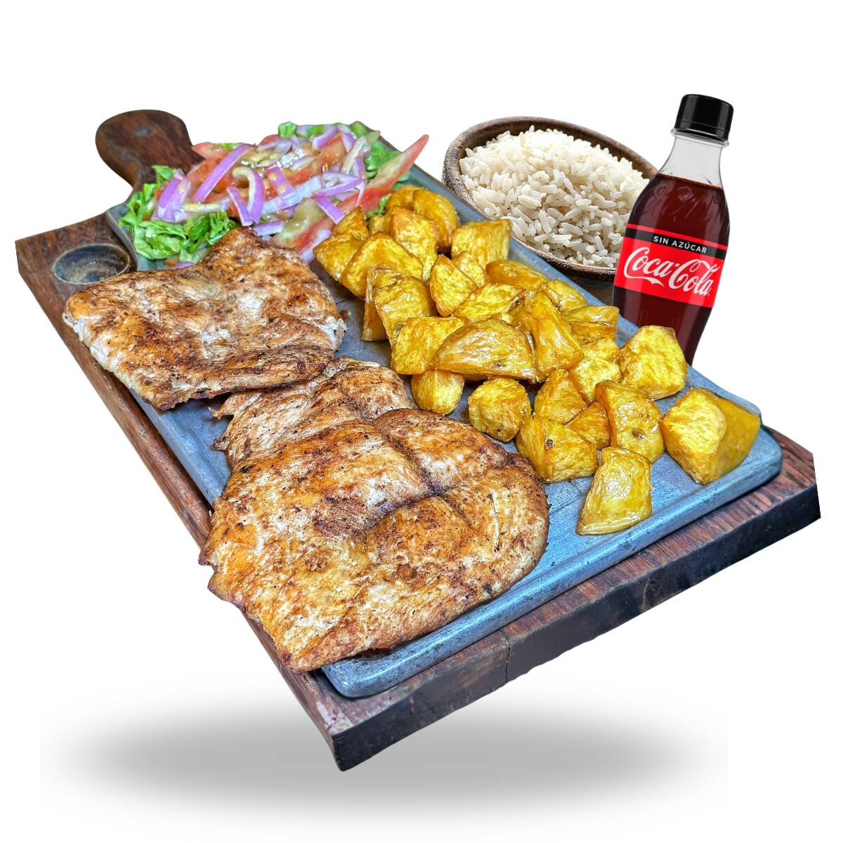 FILETE DE PECHUGA 250GR APROX, PAPA AMARILLA, ENSALADA, ARROZ, COCA COLA CERO 250ML