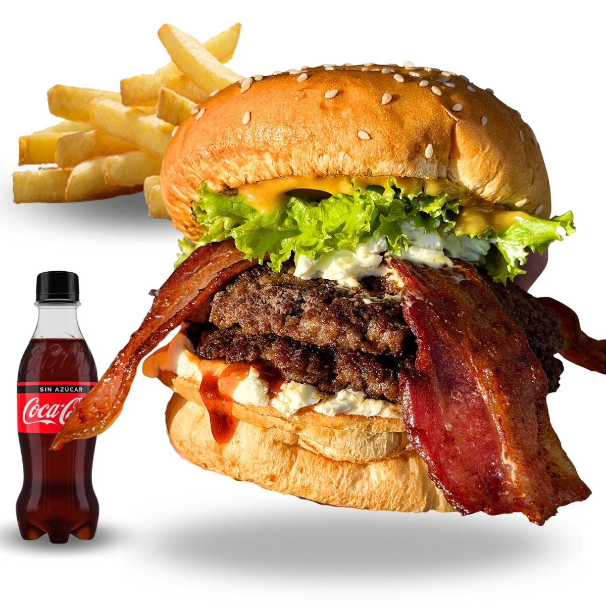 Hamburguesa doble philadelphia 300gr angus, papas a la francesa, coca cola cero 250ml.