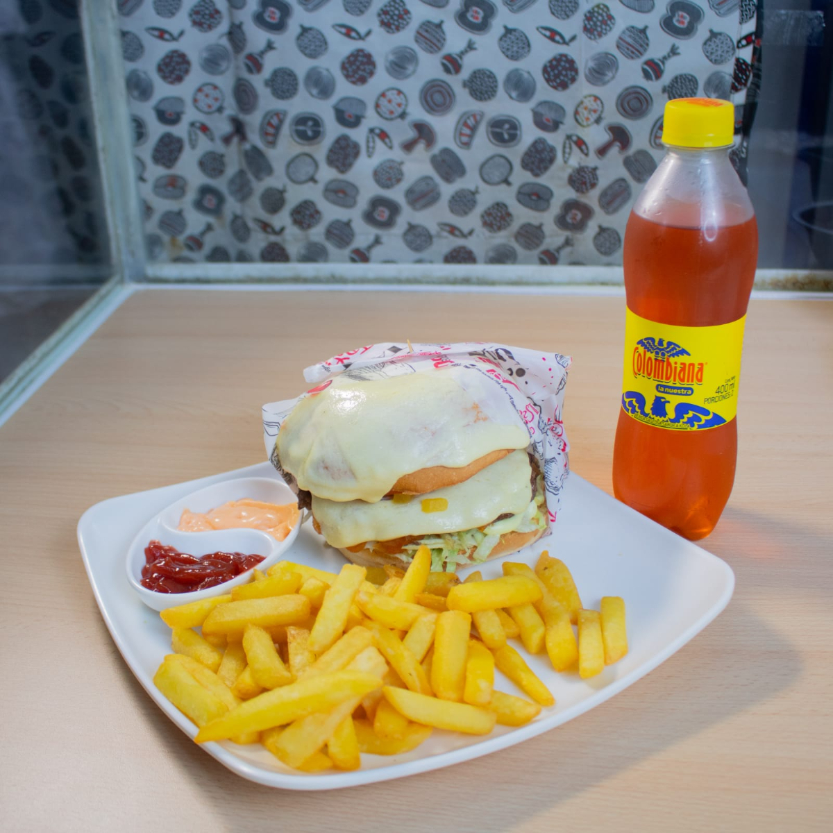 Hamburguesa especial con papas y gaseosa 400ml