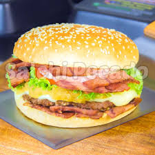 Pan, doble carne de res, tocineta, pollo, lechuga, ripio, tomate, cebolla caramelizada, piña calada, doble queso y salsas
