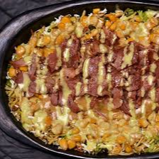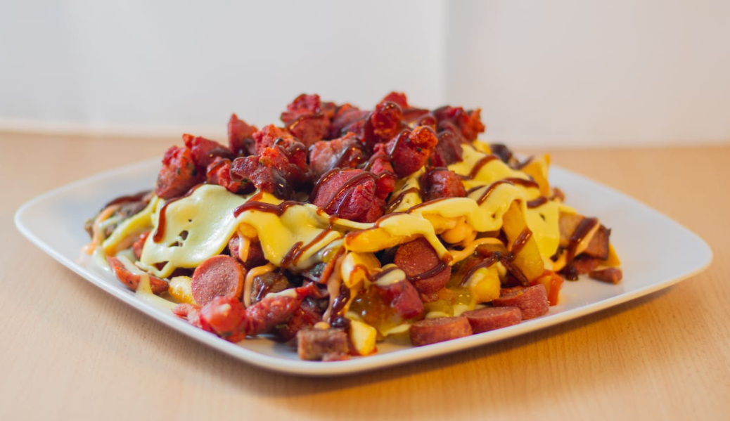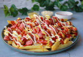 2 porciones de Papa, salchicha,carne hamburguesa,tocineta, costilla ahumada, quesos,salsas