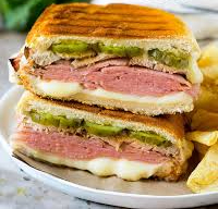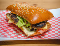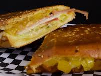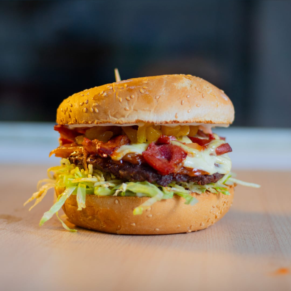Pan bañado en queso, carne de res, lechuga, ripio, cebolla caramelizada, tomate, piña calada y salsas.