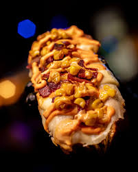 Pan relleno de tocineta, piña calada, ripio, crema de cebolla, queso y salsas.