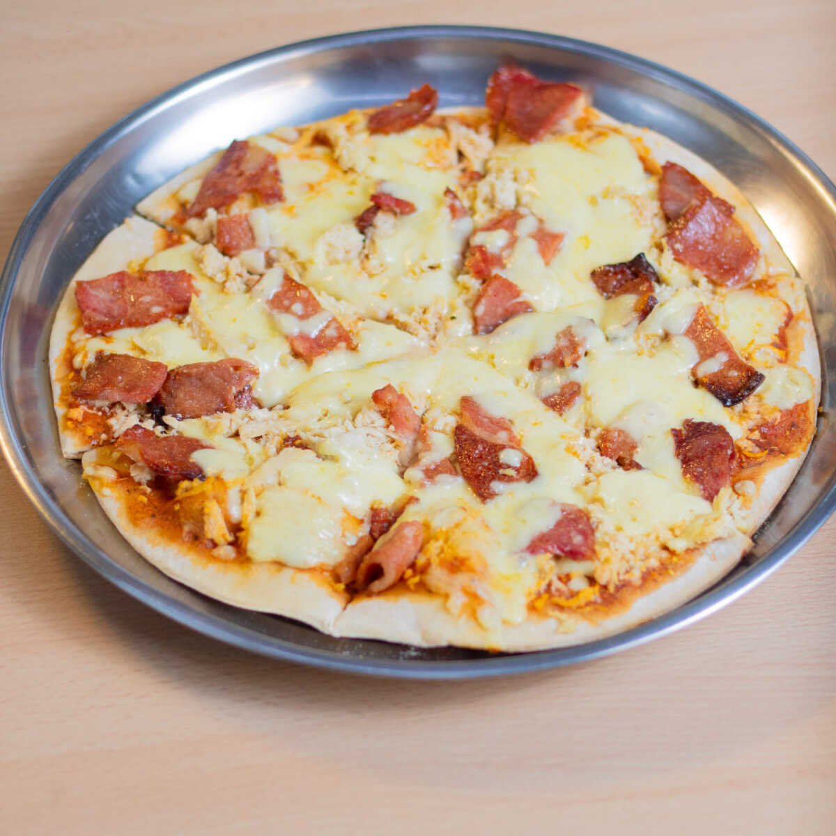 Combinación clásica de queso, piña calada y jamón sobre base de salsa de tomate.